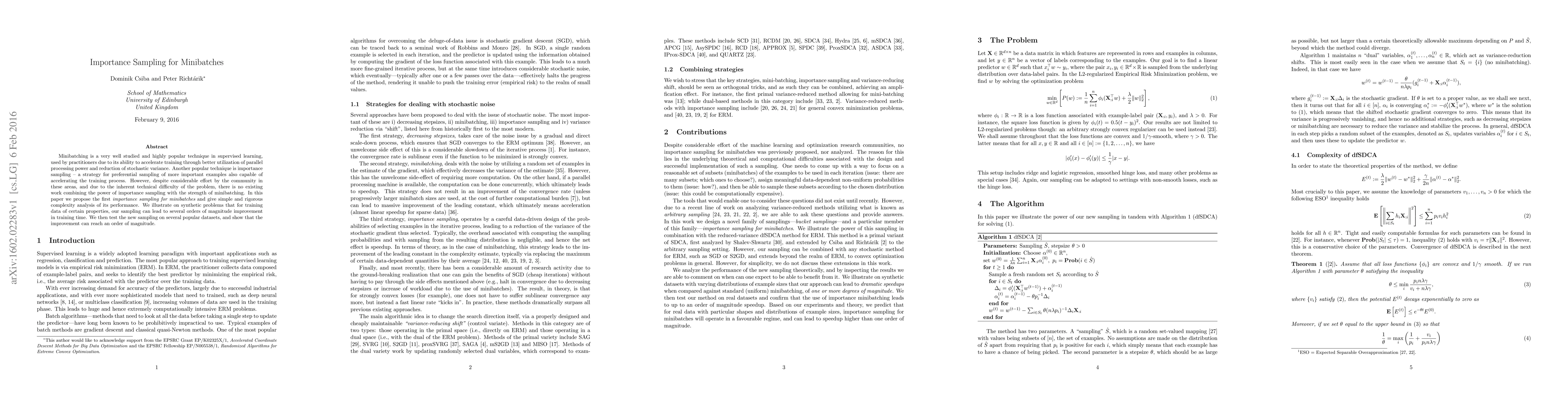 Researchers propose a new technique called importance sampling for minibatches to accelerate training in supervised learning, achieving orders of magnitude improvement in training time on synthetic and real-world datasets.