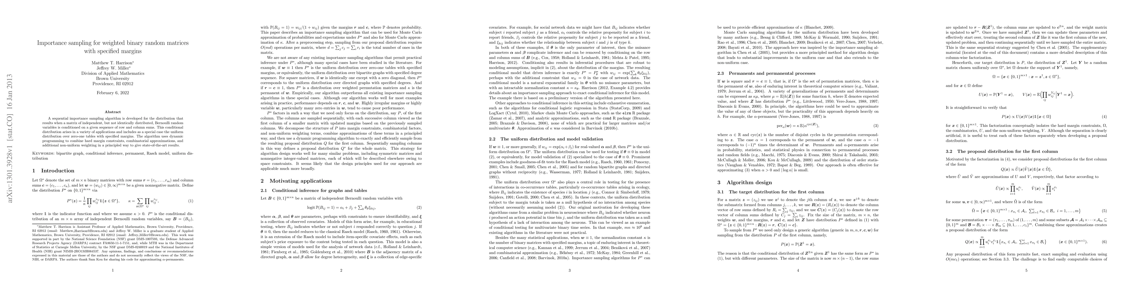 A new importance sampling algorithm efficiently computes distributions of binary random matrices conditioned on specified row and column sums, leveraging dynamic programming and combinatorial approximations for superior results. This method applies broadly across various fields, including generating uniform zero-one tables with fixed margins.