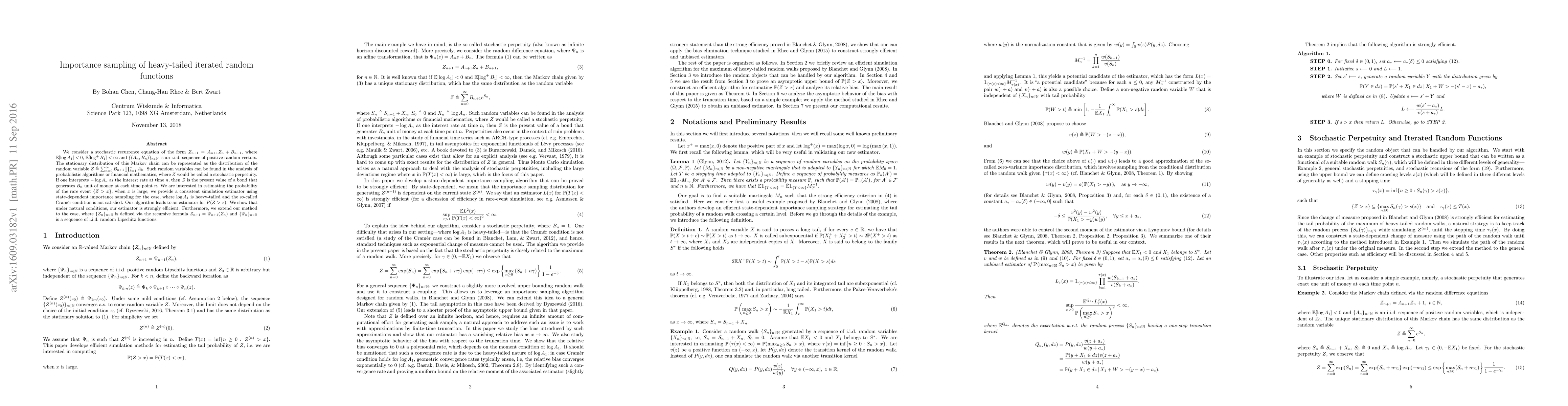 We consider a stochastic recurrence equation of the form $Z_{n+1} = A_{n+1} Z_n+B_{n+1}$, where $\mathbb{E}[\log A_1]<0$, $\mathbb{E}[\log^+ B_1]<\infty$ and $\{(A_n,B_n)\}_{n\in\mathbb{N}}$ is an i.i.d. sequence of positive random vectors. The stationary distribution of this Markov chain can be represented as the distribution of the random variable $Z \triangleq \sum_{n=0}^\infty B_{n+1}\prod_{k=1}^nA_k$. Such random variables can be found in the analysis of probabilistic algorithms or financial mathematics, where $Z$ would be called a stochastic perpetuity. If one interprets $-\log A_n$ as the interest rate at time $n$, then $Z$ is the present value of a bond that generates $B_n$ unit of money at each time point $n$. We are interested in estimating the probability of the rare event $\{Z>x\}$, when $x$ is large; we provide a consistent simulation estimator using state-dependent importance sampling for the case, where $\log A_1$ is heavy-tailed and the so-called Cram\'{e}r condition is not satisfied. Our algorithm leads to an estimator for $P(Z>x)$. We show that under natural conditions, our estimator is strongly efficient. Furthermore, we extend our method to the case, where $\{Z_n\}_{n\in\mathbb{N}}$ is defined via the recursive formula $Z_{n+1}=\Psi_{n+1}(Z_n)$ and $\{\Psi_n\}_{n\in\mathbb{N}}$ is a sequence of i.i.d. random Lipschitz functions.