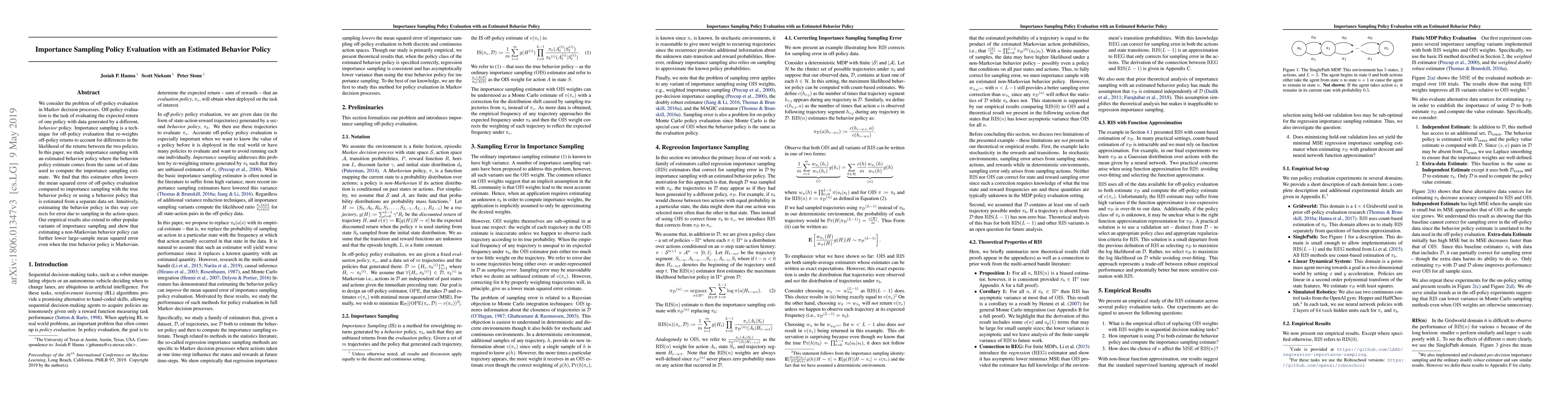 This paper investigates importance sampling for off-policy evaluation in Markov decision processes, focusing on scenarios where the behavior policy is estimated from the same data used for evaluation. The study finds that this approach often reduces mean squared error compared to using the true or separately estimated behavior policy, correcting for sampling errors in the action space.