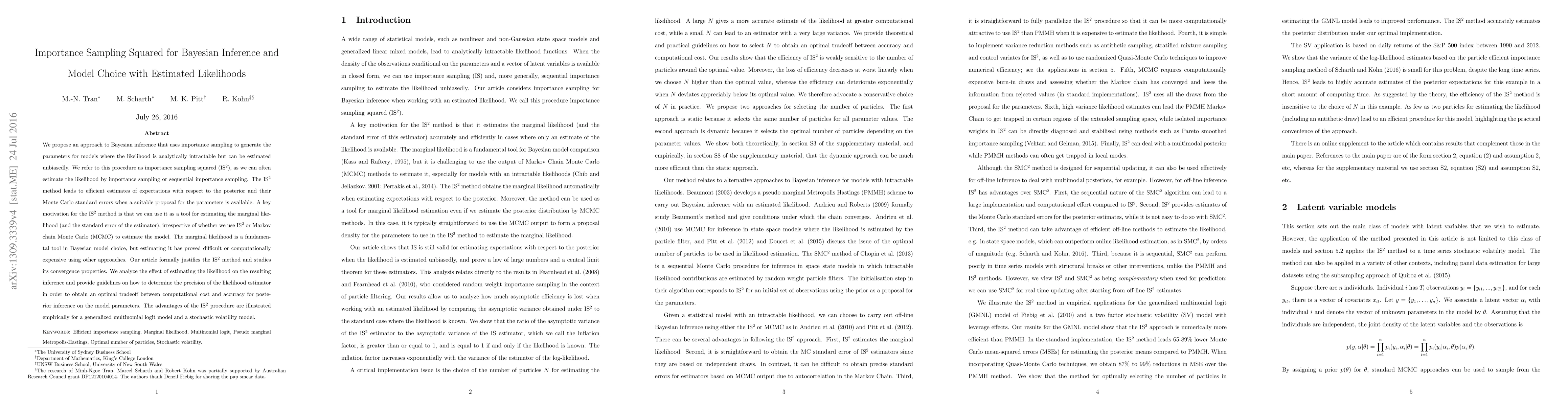 This paper introduces importance sampling squared (IS2) for Bayesian inference in latent variable models where the likelihood is analytically intractable. IS2 leverages importance sampling to estimate the likelihood, providing a formal justification and analyzing its convergence properties, aiming to balance computational cost and accuracy for posterior inference.