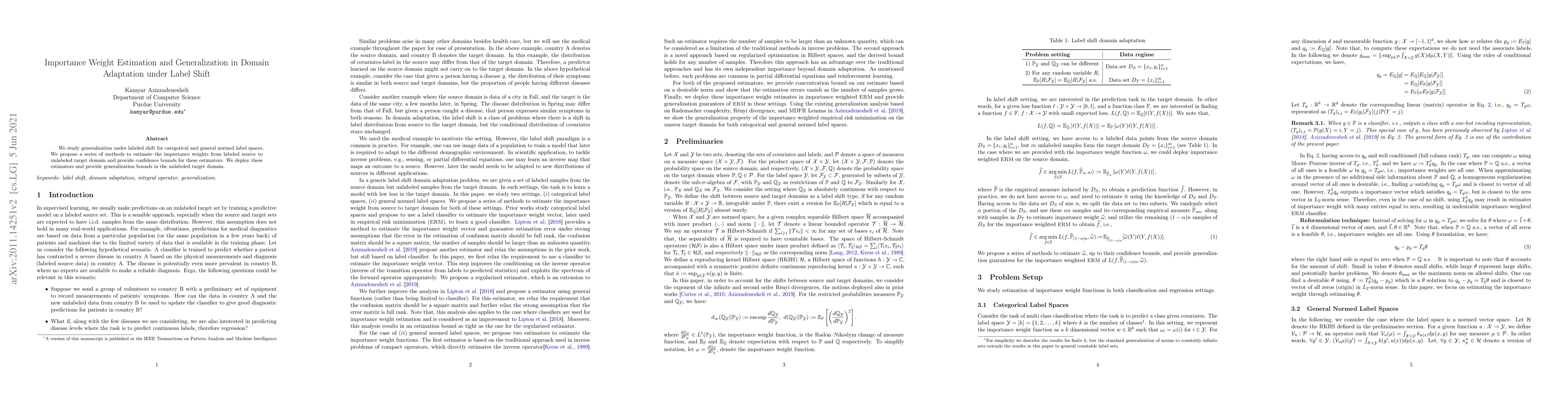 We study generalization under labeled shift for categorical and general normed label spaces. We propose a series of methods to estimate the importance weights from labeled source to unlabeled target domain and provide confidence bounds for these estimators. We deploy these estimators and provide generalization bounds in the unlabeled target domain.