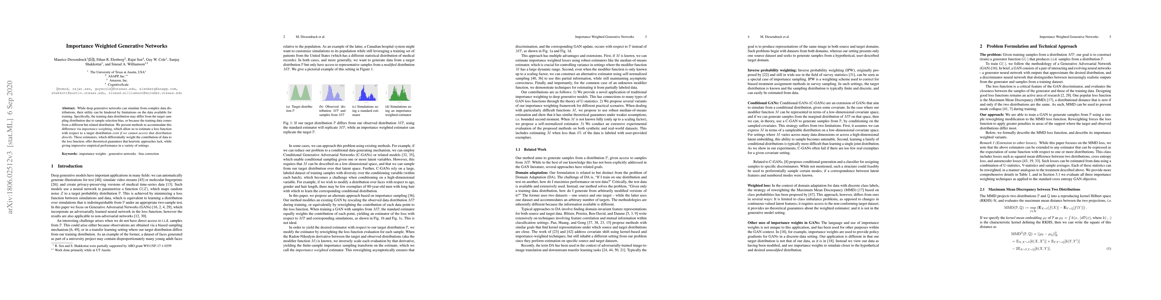 Deep generative networks can simulate from a complex target distribution, by minimizing a loss with respect to samples from that distribution. However, often we do not have direct access to our target distribution - our data may be subject to sample selection bias, or may be from a different but related distribution. We present methods based on importance weighting that can estimate the loss with respect to a target distribution, even if we cannot access that distribution directly, in a variety of settings. These estimators, which differentially weight the contribution of data to the loss function, offer both theoretical guarantees and impressive empirical performance.