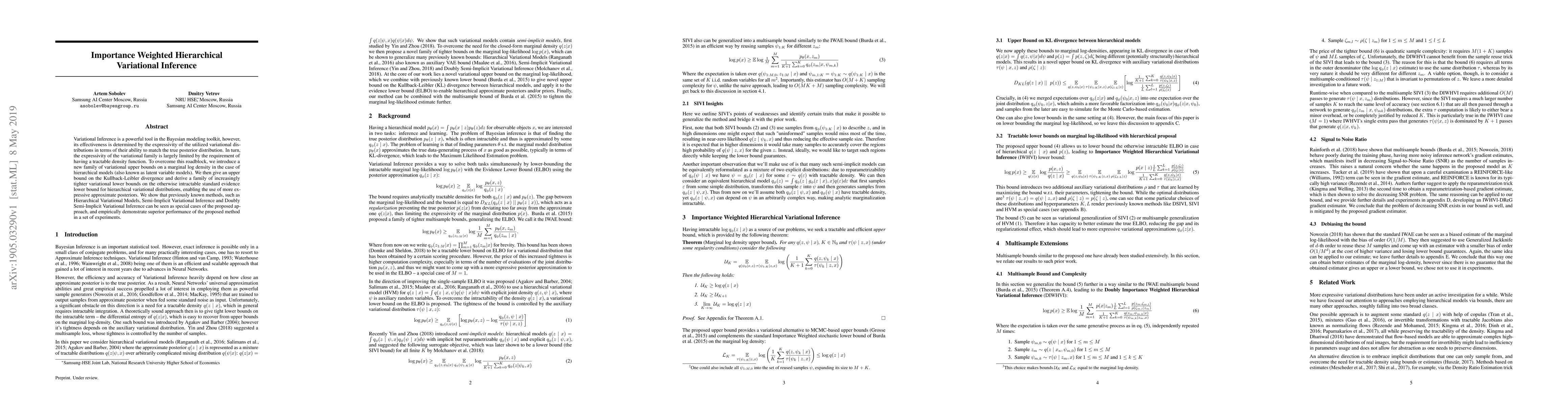The paper introduces a new family of variational upper bounds on a marginal log density for hierarchical models, enabling the use of more expressive approximate posteriors by providing tractable lower bounds on the intractable standard evidence lower bound.