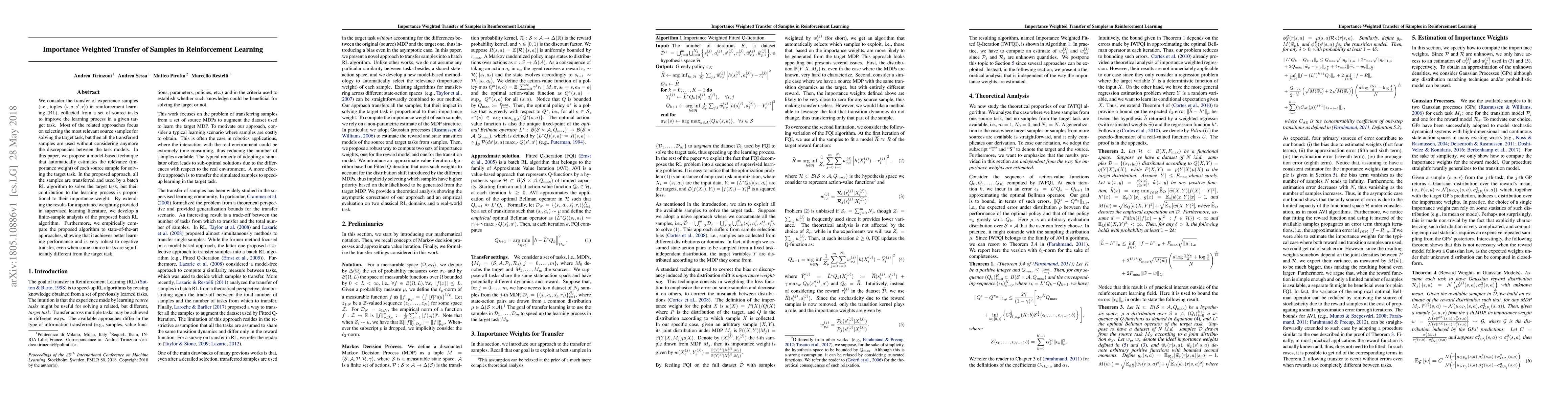 We consider the transfer of experience samples (i.e., tuples < s, a, s', r >) in reinforcement learning (RL), collected from a set of source tasks to improve the learning process in a given target task. Most of the related approaches focus on selecting the most relevant source samples for solving the target task, but then all the transferred samples are used without considering anymore the discrepancies between the task models. In this paper, we propose a model-based technique that automatically estimates the relevance (importance weight) of each source sample for solving the target task. In the proposed approach, all the samples are transferred and used by a batch RL algorithm to solve the target task, but their contribution to the learning process is proportional to their importance weight. By extending the results for importance weighting provided in supervised learning literature, we develop a finite-sample analysis of the proposed batch RL algorithm. Furthermore, we empirically compare the proposed algorithm to state-of-the-art approaches, showing that it achieves better learning performance and is very robust to negative transfer, even when some source tasks are significantly different from the target task.