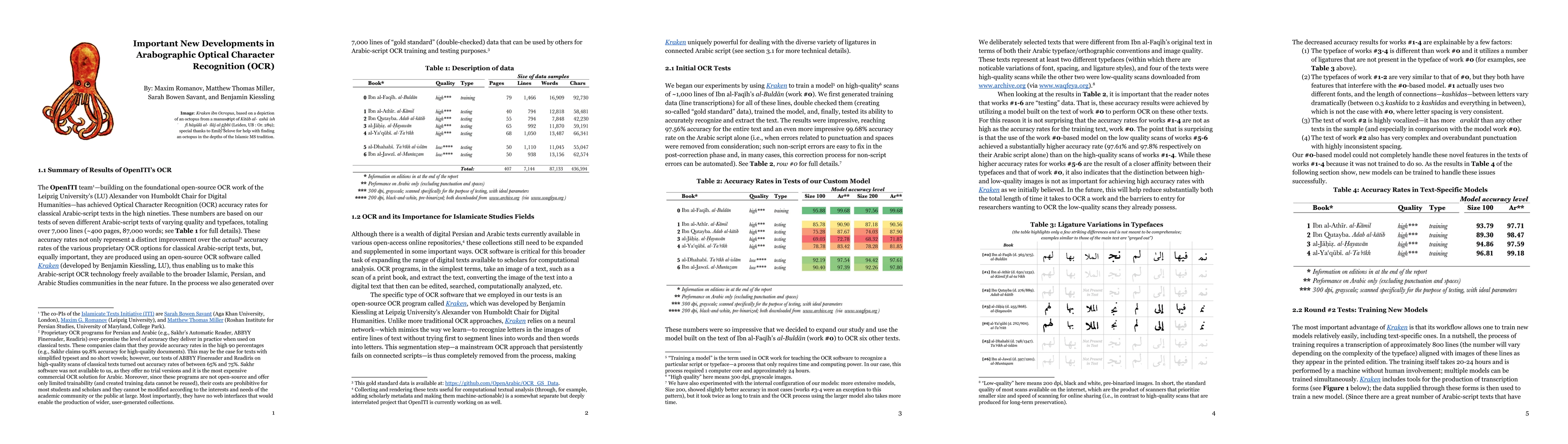 The OpenITI team has significantly improved OCR accuracy for classical Arabic-script texts, achieving high nineties percentages using open-source software, surpassing proprietary options and making the technology freely accessible to Islamic, Persian, and Arabic Studies communities.