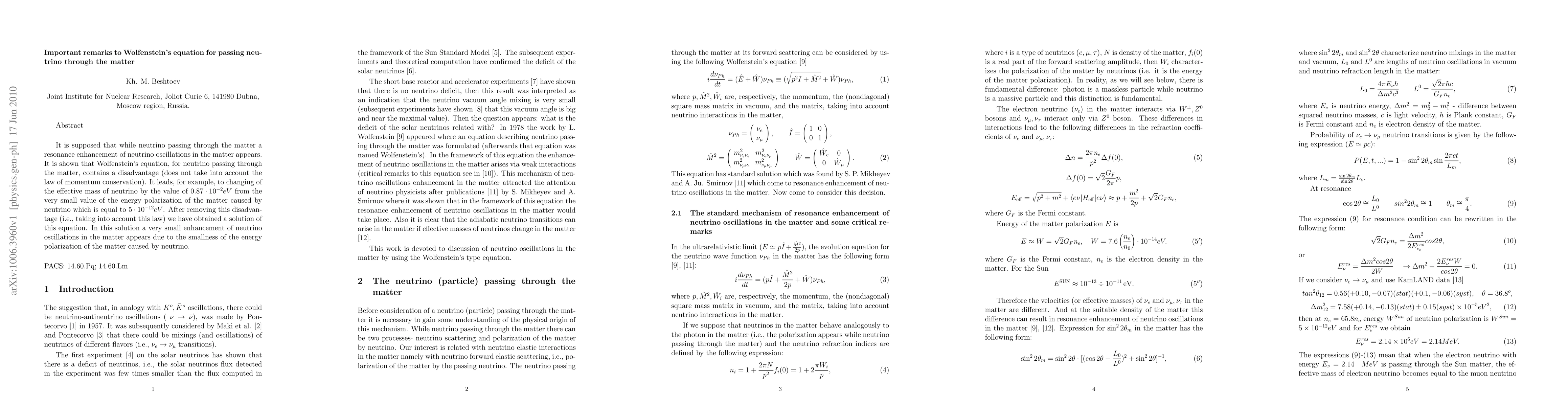 It is supposed that while neutrino passing through the matter a resonance enhancement of neutrino oscillations in the matter appears. It is shown that Wolfenstein's equation, for neutrino passing through the matter, contains a disadvantage (does not take into account the law of momentum conservation). It leads, for example, to changing of the effective mass of neutrino by the value of $0.87 \cdot 10^{-2} eV$ from the very small value of the energy polarization of the matter caused by neutrino which is equal to $5 \cdot 10^{-12} eV$. After removing this disadvantage (i.e., taking into account this law) we have obtained a solution of this equation. In this solution a very small enhancement of neutrino oscillations in the matter appears due to the smallness of the energy polarization of the matter caused by neutrino.