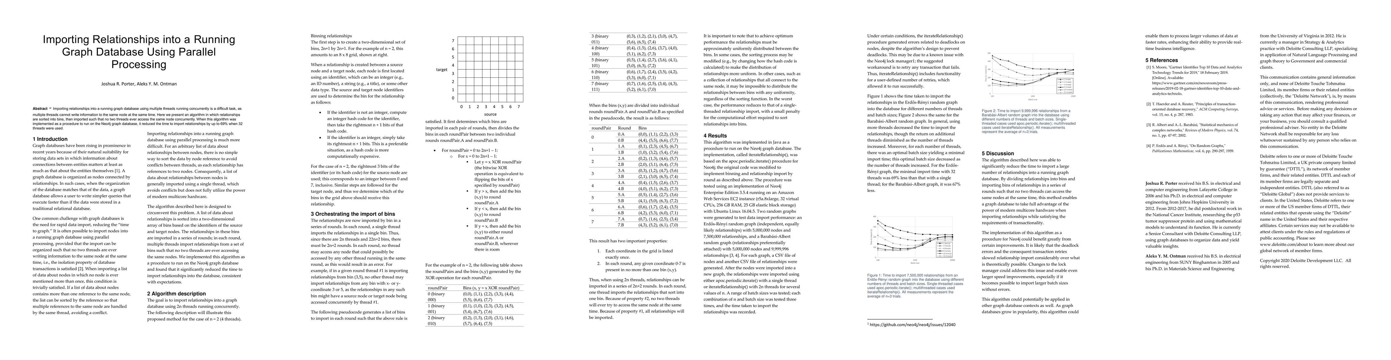 Researchers developed an algorithm to import relationships into a running graph database using parallel processing, reducing import time by up to 69% with 32 threads.