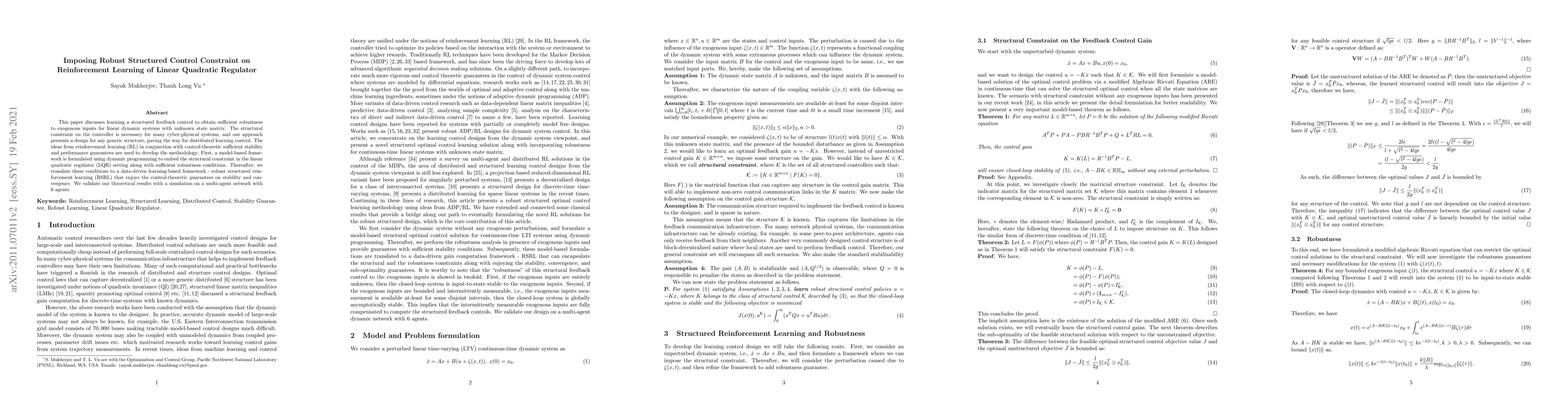 This paper discusses learning a structured feedback control to obtain sufficient robustness to exogenous inputs for linear dynamic systems with unknown state matrix. The structural constraint on the controller is necessary for many cyber-physical systems, and our approach presents a design for any generic structure, paving the way for distributed learning control. The ideas from reinforcement learning (RL) in conjunction with control-theoretic sufficient stability and performance guarantees are used to develop the methodology. First, a model-based framework is formulated using dynamic programming to embed the structural constraint in the linear quadratic regulator (LQR) setting along with sufficient robustness conditions. Thereafter, we translate these conditions to a data-driven learning-based framework - robust structured reinforcement learning (RSRL) that enjoys the control-theoretic guarantees on stability and convergence. We validate our theoretical results with a simulation on a multi-agent network with 6 agents.
