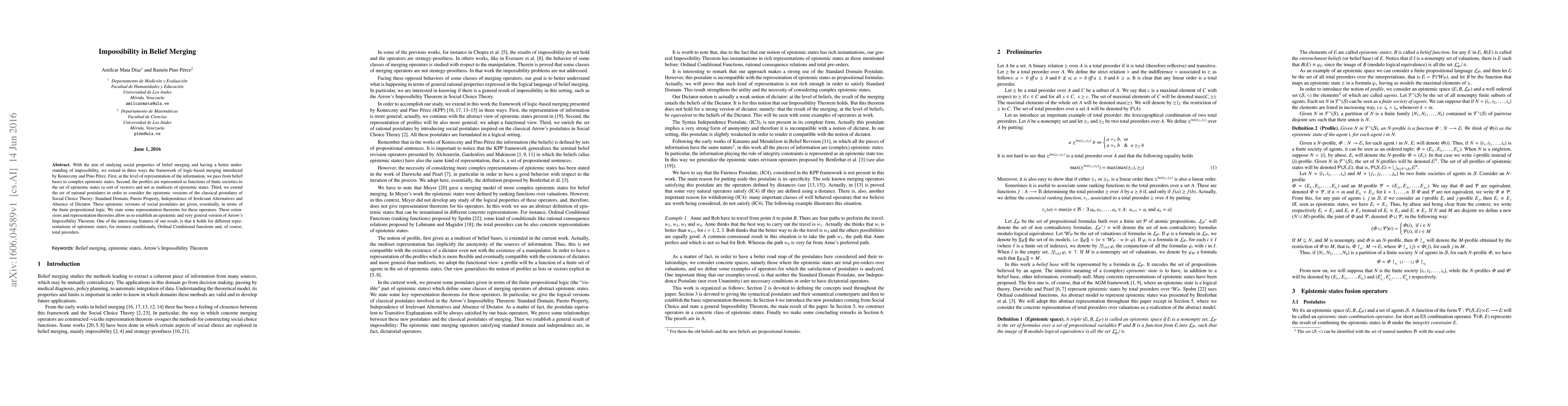 With the aim of studying social properties of belief merging and having a better understanding of impossibility, we extend in three ways the framework of logic-based merging introduced by Konieczny and Pino P\'erez. First, at the level of representation of the information, we pass from belief bases to complex epistemic states. Second, the profiles are represented as functions of finite societies to the set of epistemic states (a sort of vectors) and not as multisets of epistemic states. Third, we extend the set of rational postulates in order to consider the epistemic versions of the classical postulates of Social Choice Theory: Standard Domain, Pareto Property, Independence of Irrelevant Alternatives and Absence of Dictator. These epistemic versions of social postulates are given, essentially, in terms of the finite propositional logic. We state some representation theorems for these operators. These extensions and representation theorems allow us to establish an epistemic and very general version of Arrow's Impossibility Theorem. One of the interesting features of our result, is that it holds for different representations of epistemic states; for instance conditionals, Ordinal Conditional functions and, of course, total preorders.