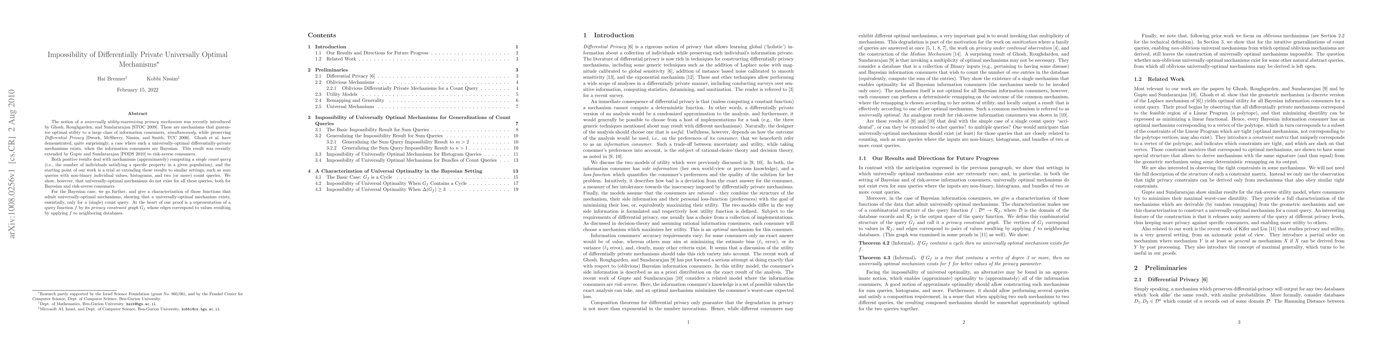 This paper proves the impossibility of constructing universally optimal differentially private mechanisms for sum queries, histograms, and multiple count queries, contrasting with the existence of such mechanisms for single count queries. It characterizes the conditions under which universally-optimal mechanisms can exist, showing they are limited to single count queries, grounded in the privacy constraint graph representation of query functions.