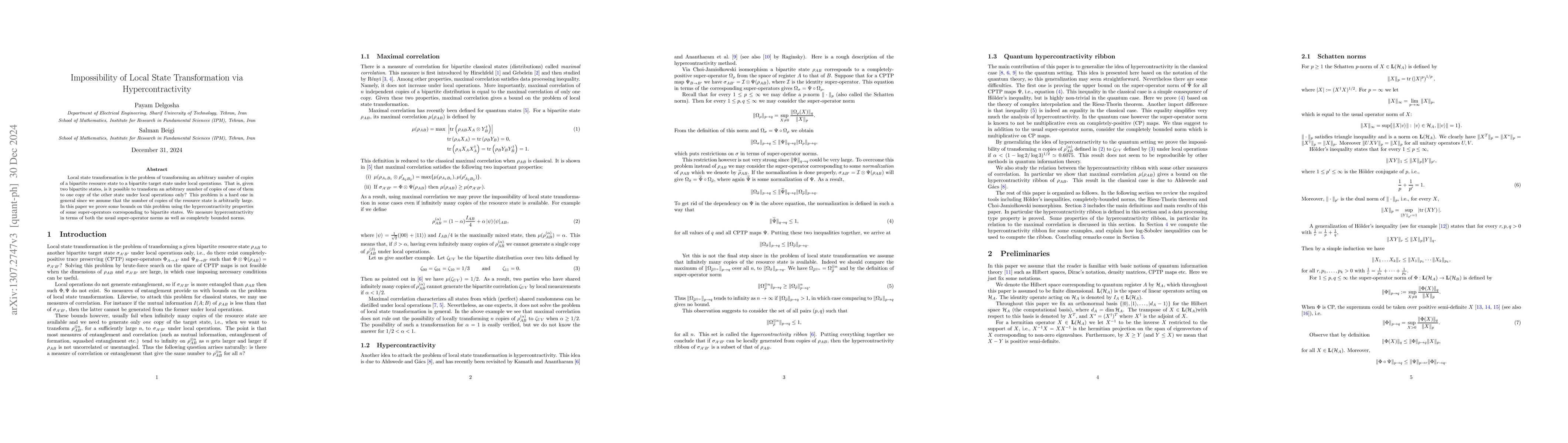 Researchers prove bounds on local state transformation via hypercontractivity for bipartite states, showing that transforming an arbitrary number of copies to a target state is generally impossible under local operations.
