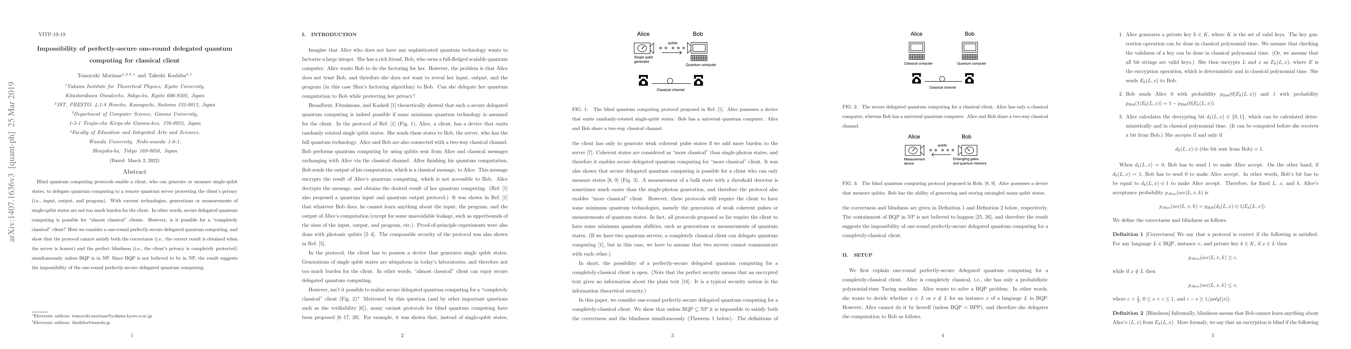 This paper demonstrates that perfectly-secure one-round delegated quantum computing for a completely classical client is impossible, as it cannot achieve both correctness and perfect blindness unless BQP is in NP, which is not believed to be true. Thus, secure delegated quantum computing is feasible only for "almost classical" clients.