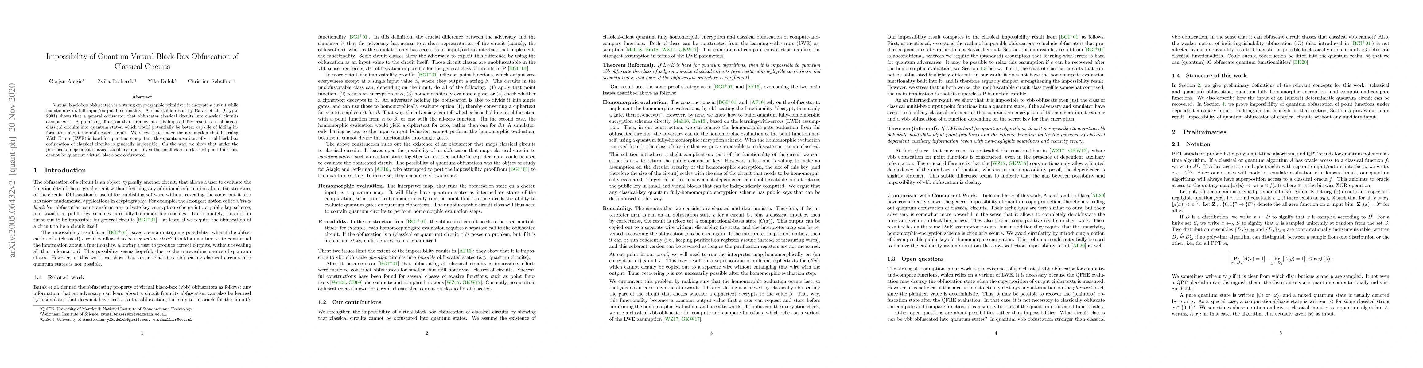 Virtual black-box obfuscation is a strong cryptographic primitive: it encrypts a circuit while maintaining its full input/output functionality. A remarkable result by Barak et al. (Crypto 2001) shows that a general obfuscator that obfuscates classical circuits into classical circuits cannot exist. A promising direction that circumvents this impossibility result is to obfuscate classical circuits into quantum states, which would potentially be better capable of hiding information about the obfuscated circuit. We show that, under the assumption that learning-with-errors (LWE) is hard for quantum computers, this quantum variant of virtual black-box obfuscation of classical circuits is generally impossible. On the way, we show that under the presence of dependent classical auxiliary input, even the small class of classical point functions cannot be quantum virtual black-box obfuscated.