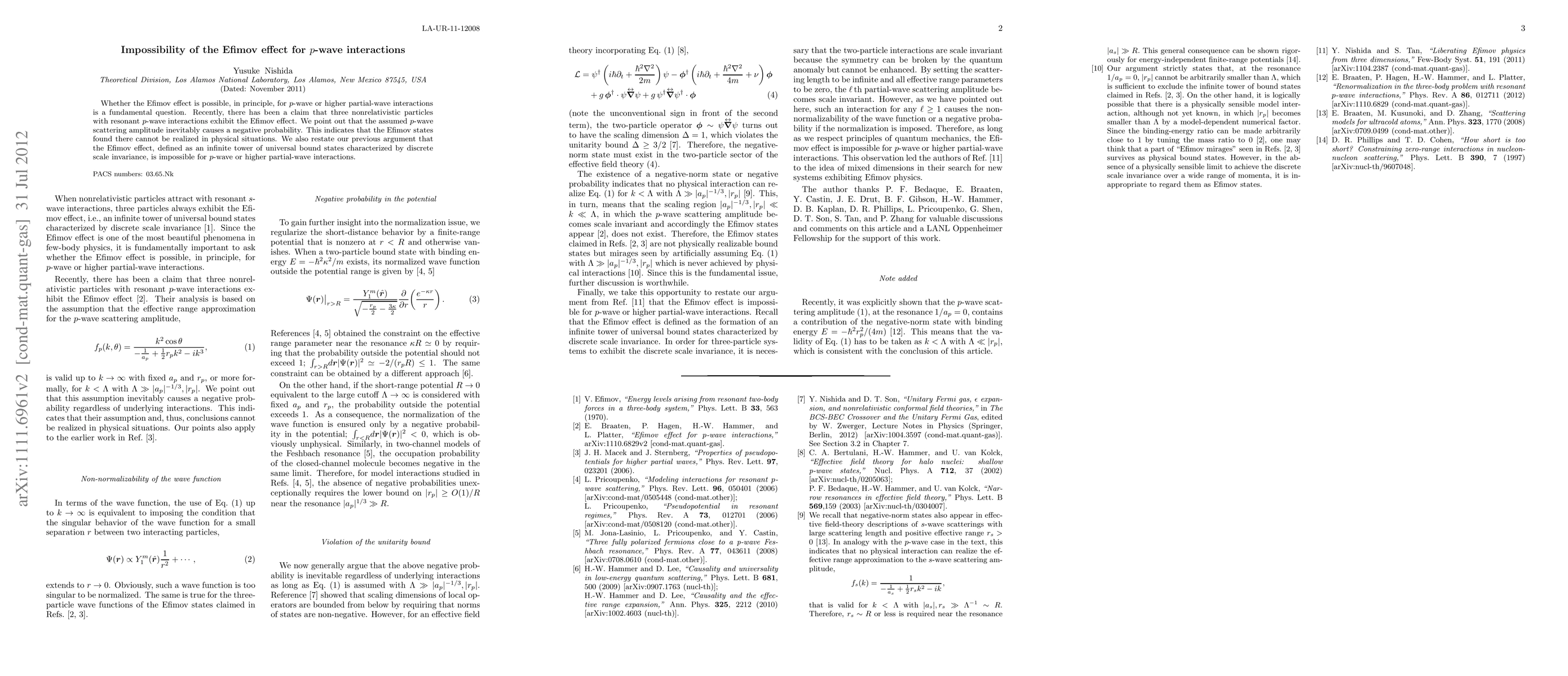The paper argues that the Efimov effect, which involves an infinite series of bound states, is impossible for p-wave or higher partial-wave interactions due to the inherent negative probability in the assumed scattering amplitude, invalidating the claimed realization of such states. This reaffirms the impossibility of the Efimov effect for non-s-wave interactions.
