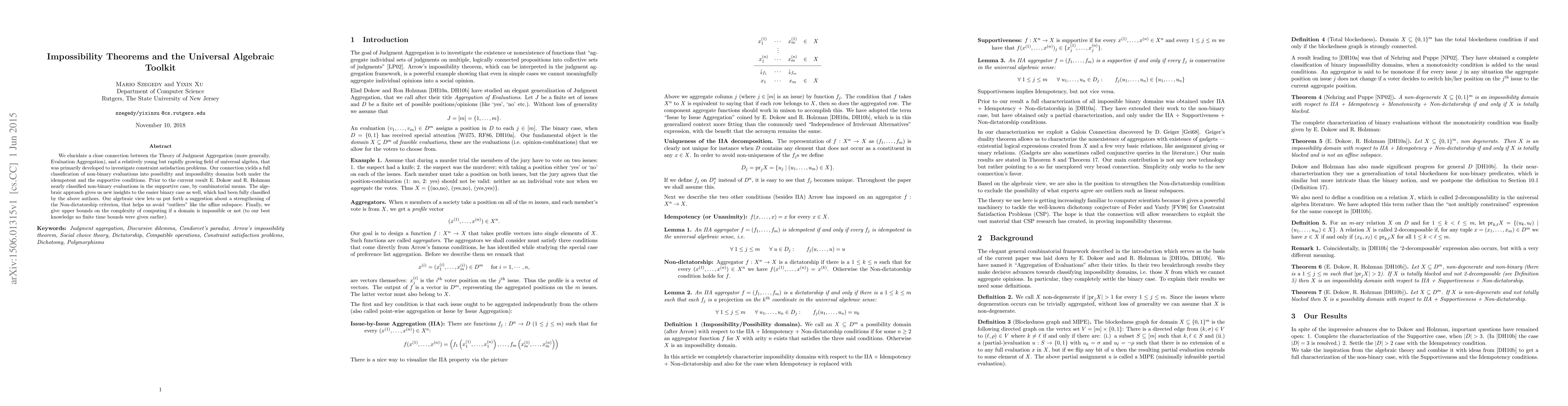 This research establishes a link between Judgment Aggregation and Universal Algebra, providing a complete classification of non-binary evaluations under possibility and impossibility domains, both idempotent and supportive. It offers new insights into the binary case and suggests a strengthening of the Non-dictatorship criterion, also presenting the first known upper bounds on computing impossibility domain complexity.