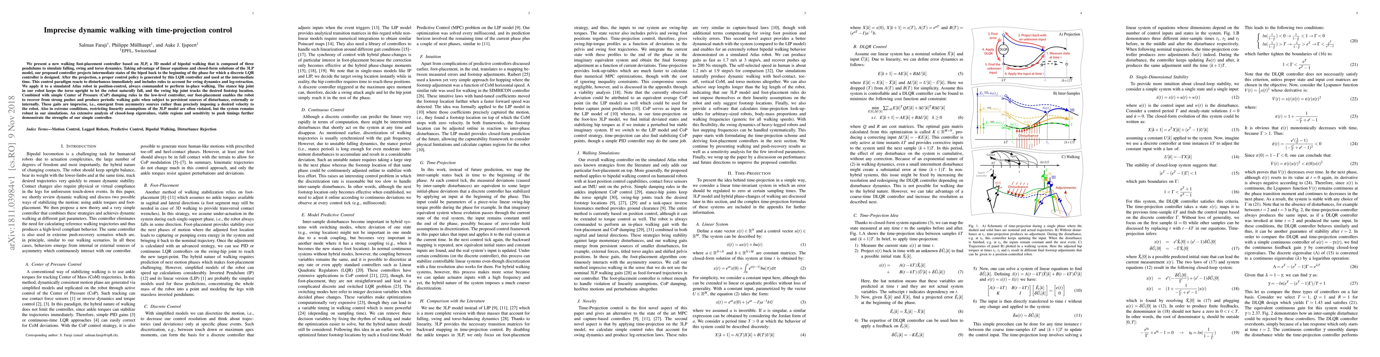 We present a new walking foot-placement controller based on 3LP, a 3D model of bipedal walking that is composed of three pendulums to simulate falling, swing and torso dynamics. Taking advantage of linear equations and closed-form solutions of the 3LP model, our proposed controller projects intermediate states of the biped back to the beginning of the phase for which a discrete LQR controller is designed. After the projection, a proper control policy is generated by this LQR controller and used at the intermediate time. This control paradigm reacts to disturbances immediately and includes rules to account for swing dynamics and leg-retraction. We apply it to a simulated Atlas robot in position-control, always commanded to perform in-place walking. The stance hip joint in our robot keeps the torso upright to let the robot naturally fall, and the swing hip joint tracks the desired footstep location. Combined with simple Center of Pressure (CoP) damping rules in the low-level controller, our foot-placement enables the robot to recover from strong pushes and produce periodic walking gaits when subject to persistent sources of disturbance, externally or internally. These gaits are imprecise, i.e., emergent from asymmetry sources rather than precisely imposing a desired velocity to the robot. Also in extreme conditions, restricting linearity assumptions of the 3LP model are often violated, but the system remains robust in our simulations. An extensive analysis of closed-loop eigenvalues, viable regions and sensitivity to push timings further demonstrate the strengths of our simple controller.