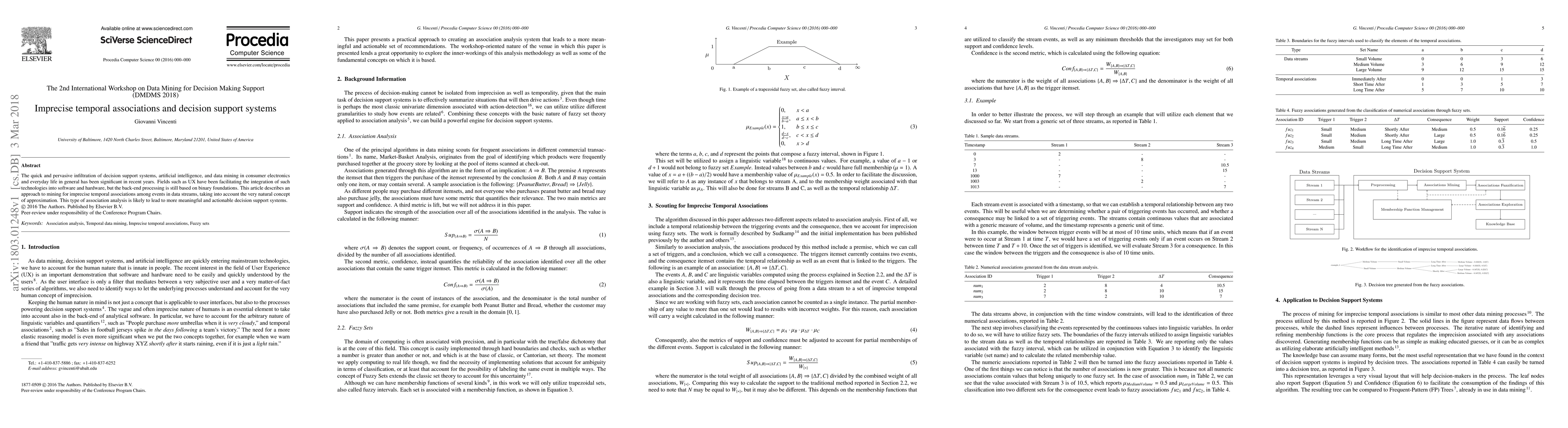 The quick and pervasive infiltration of decision support systems, artificial intelligence, and data mining in consumer electronics and everyday life in general has been significant in recent years. Fields such as UX have been facilitating the integration of such technologies into software and hardware, but the back-end processing is still based on binary foundations. This article describes an approach to mining for imprecise temporal associations among events in data streams, taking into account the very natural concept of approximation. This type of association analysis is likely to lead to more meaningful and actionable decision support systems.