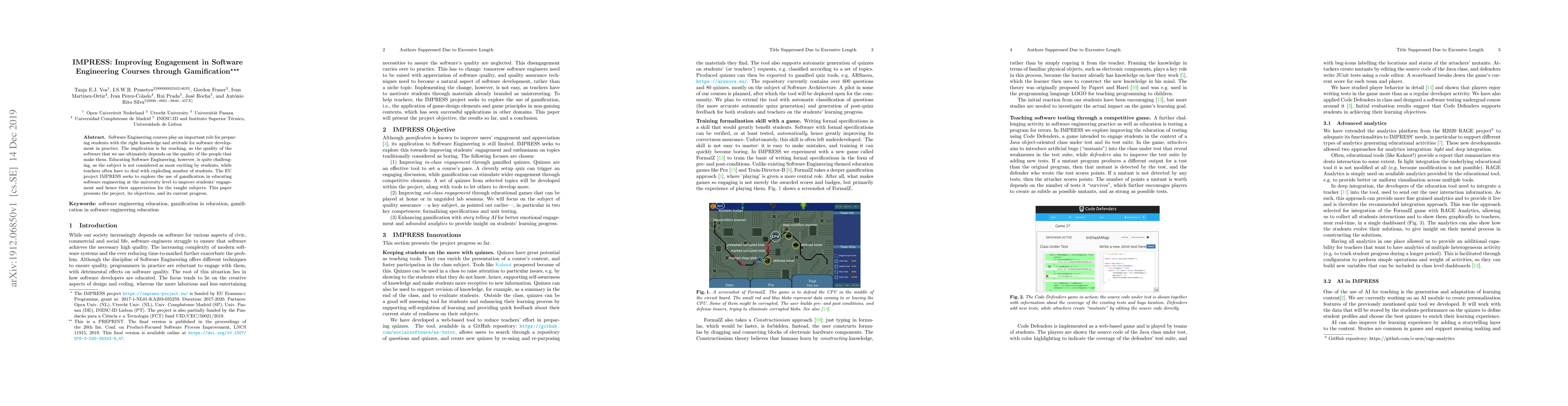 Software Engineering courses play an important role for preparing students with the right knowledge and attitude for software development in practice. The implication is far reaching, as the quality of the software that we use ultimately depends on the quality of the people that make them. Educating Software Engineering, however, is quite challenging, as the subject is not considered as most exciting by students, while teachers often have to deal with exploding number of students. The EU project IMPRESS seeks to explore the use of gamification in educating software engineering at the university level to improve students' engagement and hence their appreciation for the taught subjects. This paper presents the project, its objectives, and its current progress.