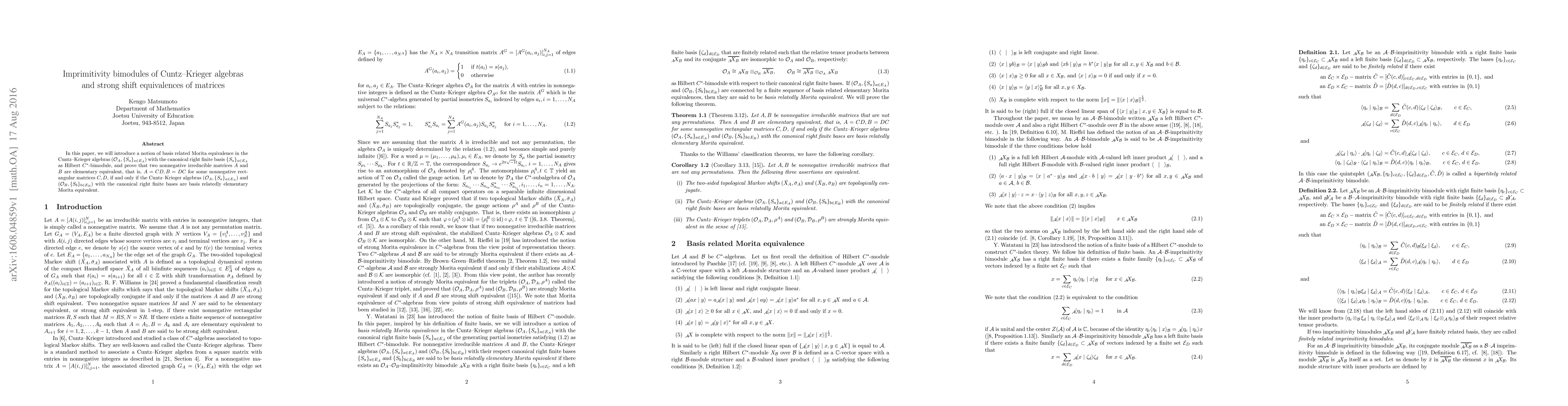This paper introduces a basis related Morita equivalence for Cuntz-Krieger algebras and proves that two nonnegative irreducible matrices are elementarily equivalent if and only if their corresponding Cuntz-Krieger algebras are basis relatedly Morita equivalent.