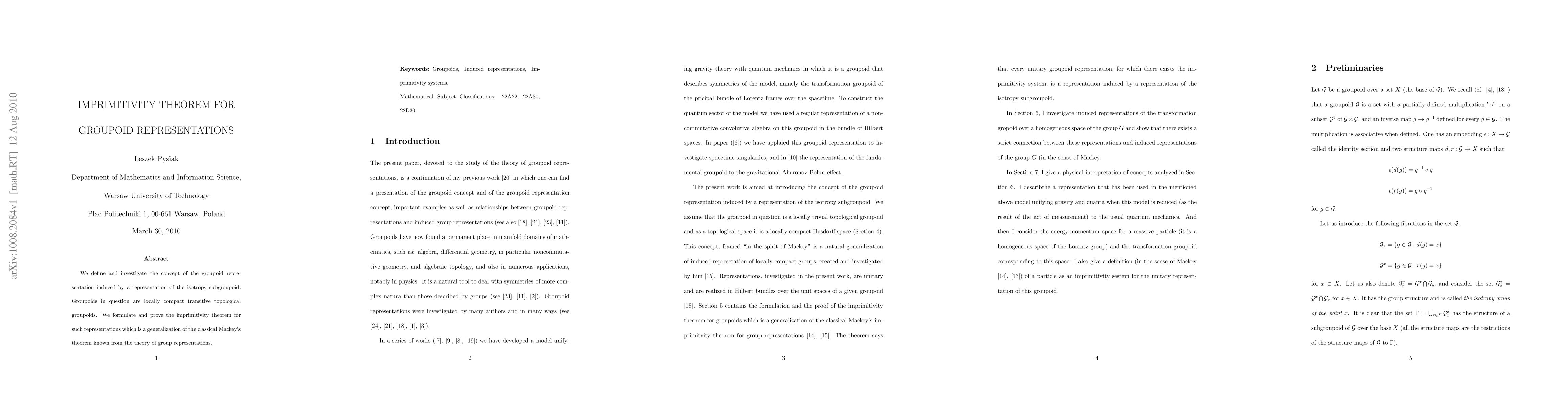 The paper introduces the concept of groupoid representations derived from isotropy subgroupoid representations and proves an imprimitivity theorem for locally compact transitive topological groupoids, generalizing Mackey's theorem from group representation theory.