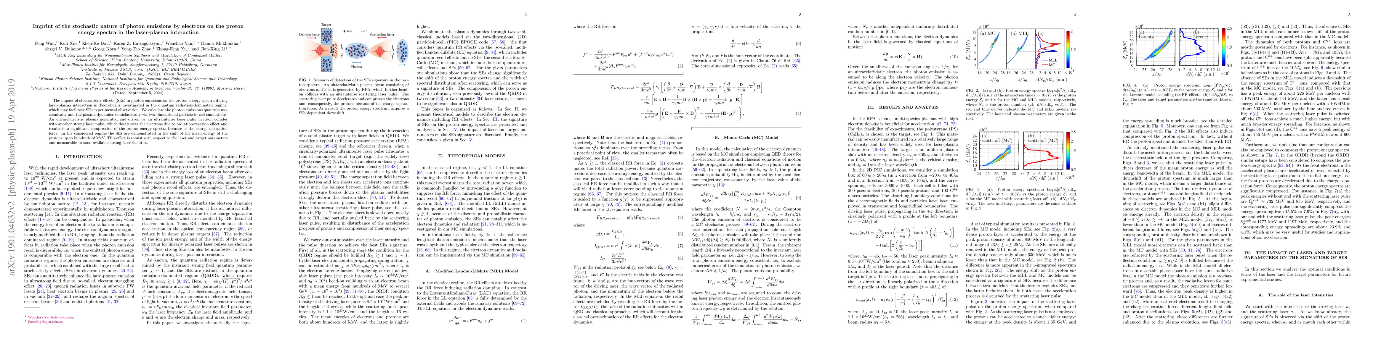The impact of stochasticity effects (SEs) in photon emissions on the proton energy spectra during laser-plasma interaction is theoretically investigated in the quantum radiation-dominated regime, which may facilitate SEs experimental observation. We calculate the photon emissions quantum mechanically and the plasma dynamics semiclassically via two-dimensional particle-in-cell simulations. An ultrarelativistic plasma generated and driven by an ultraintense laser pulse head-on collides with another strong laser pulse, which decelerates the electrons due to radiation-reaction effect and results in a significant compression of the proton energy spectra because of the charge separation force. In the considered regime the SEs are demonstrated in the shift of the mean energy of the protons up to hundreds of MeV. This effect is robust with respect to the laser and target parameters and measurable in soon available strong laser facilities.