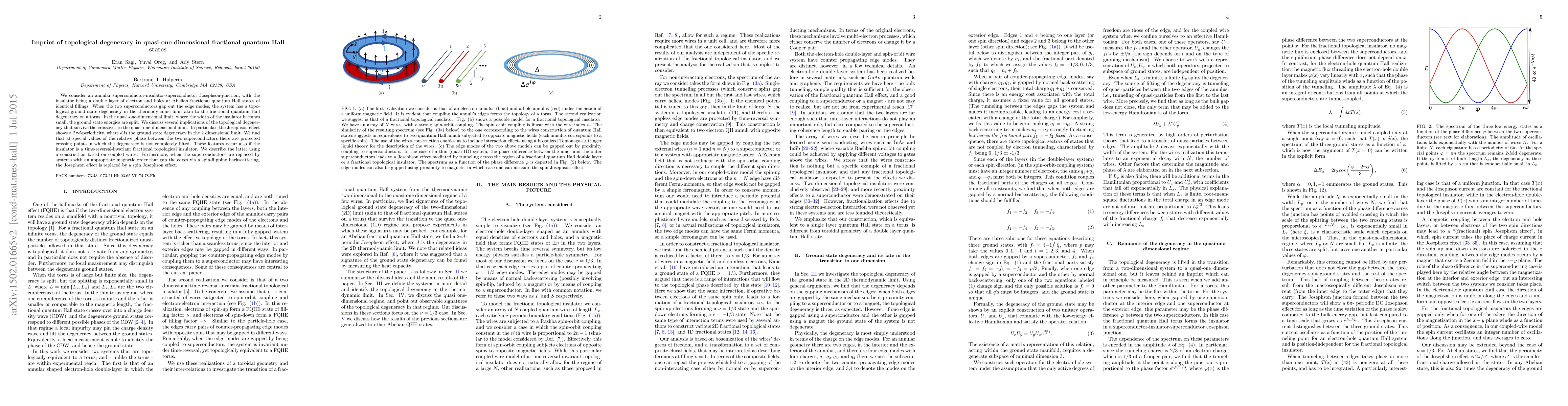We consider an annular superconductor-insulator-superconductor Josephson-junction, with the insulator being a double layer of electron and holes at Abelian fractional quantum Hall states of identical fillings. When the two superconductors gap out the edge modes, the system has a topological ground state degeneracy in the thermodynamic limit akin to the fractional quantum Hall degeneracy on a torus. In the quasi-one-dimensional limit, where the width of the insulator becomes small, the ground state energies are split. We discuss several implications of the topological degeneracy that survive the crossover to the quasi-one-dimensional limit. In particular, the Josephson effect shows a $2\pi d$-periodicity, where $d$ is the ground state degeneracy in the 2 dimensional limit. We find that at special values of the relative phase between the two superconductors there are protected crossing points in which the degeneracy is not completely lifted. These features occur also if the insulator is a time-reversal-invariant fractional topological insulator. We describe the latter using a construction based on coupled wires. Furthermore, when the superconductors are replaced by systems with an appropriate magnetic order that gap the edges via a spin-flipping backscattering, the Josephson effect is replaced by a spin Josephson effect.