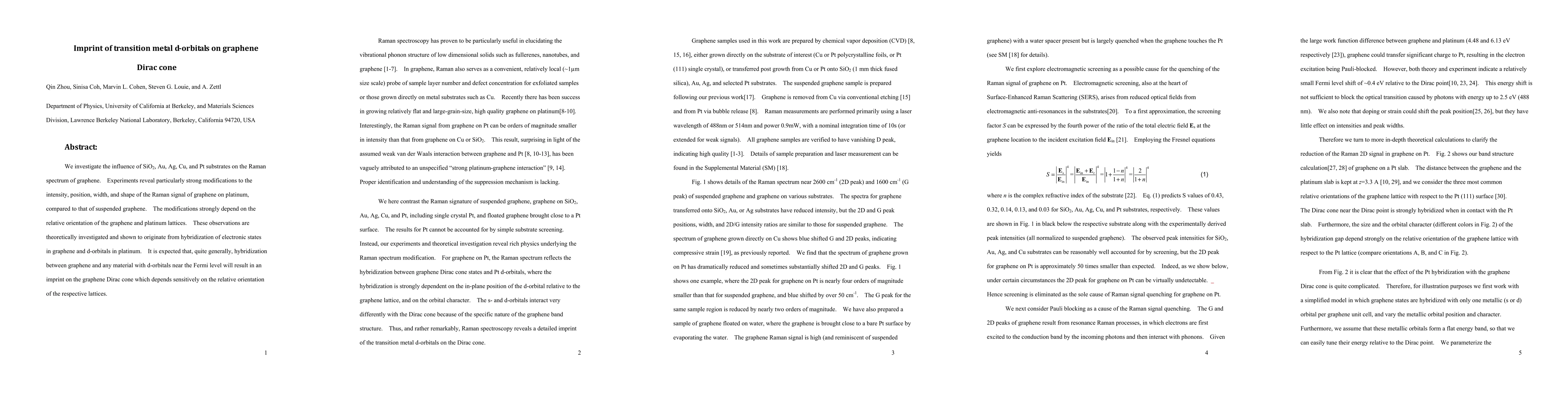 This paper explores the impact of various transition metal substrates on the Raman spectrum of graphene, finding significant changes on platinum due to lattice orientation-dependent hybridization between graphene's electronic states and platinum's d-orbitals. The study suggests that similar imprints on graphene's Dirac cone can occur with any material having d-orbitals near the Fermi level.