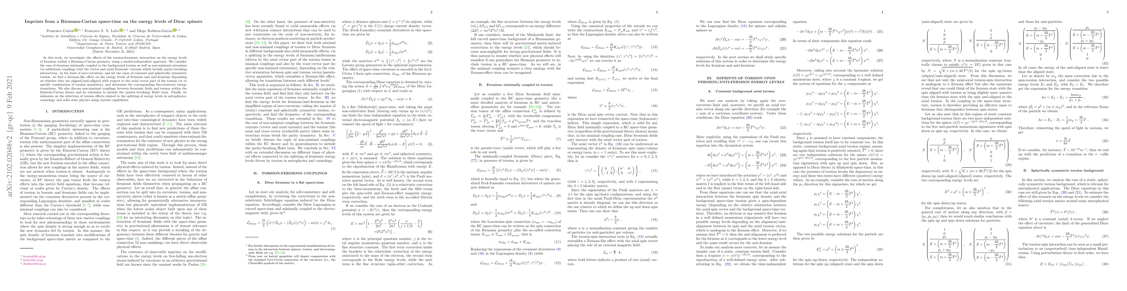 Researchers investigate how a type of complex geometry affects the energy levels of fermions, leading to a 'Zeeman-like effect' that depends on the alignment with the geometric fields. This discovery has implications for detecting torsion effects in astrophysics, cosmology, and solid-state physics.