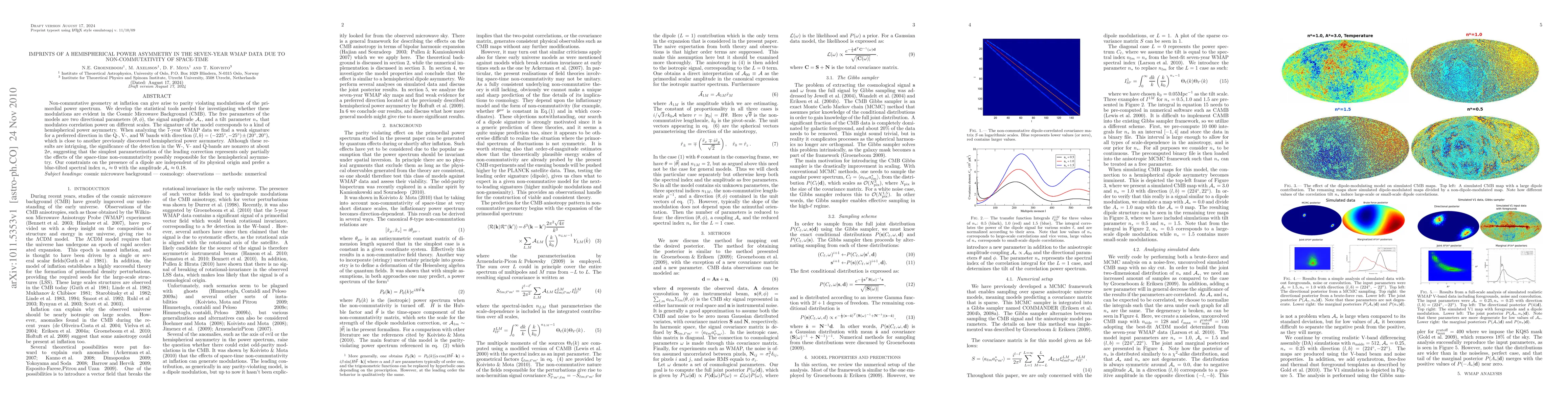 Non-commutative geometry at inflation can give arise to parity violating modulations of the primordial power spectrum. We develop the statistical tools needed for investigating whether these modulations are evident in the Cosmic Microwave Background (CMB). The free parameters of the models are two directional parameters (theta,phi), the signal amplitude A*, and a tilt parameter n* that modulates correlation power on different scales. The signature of the model corresponds to a kind of hemispherical power asymmetry. When analyzing the 7-year WMAP data we find a weak signature for a preferred direction in the Q-, V-, and W bands with direction (l,b) = (-225 deg,-25 deg) +- (20 deg, 20 deg), which is close to another previously discovered hemispherical power asymmetry. Although these results are intriguing, the significance of the detection in the W-, V- and Q-bands are nonzero at about 2 sigma, suggesting that the simplest parameterization of the leading correction represents only partially the effects of the space-time non-commutativity possibly responsible for the hemispherical asymmetry. Our constraints on the presence of a dipole are independent of its physical origin and prefer a blue-tilted spectral index n* ~ 0 with the amplitude A* ~ 0.18.