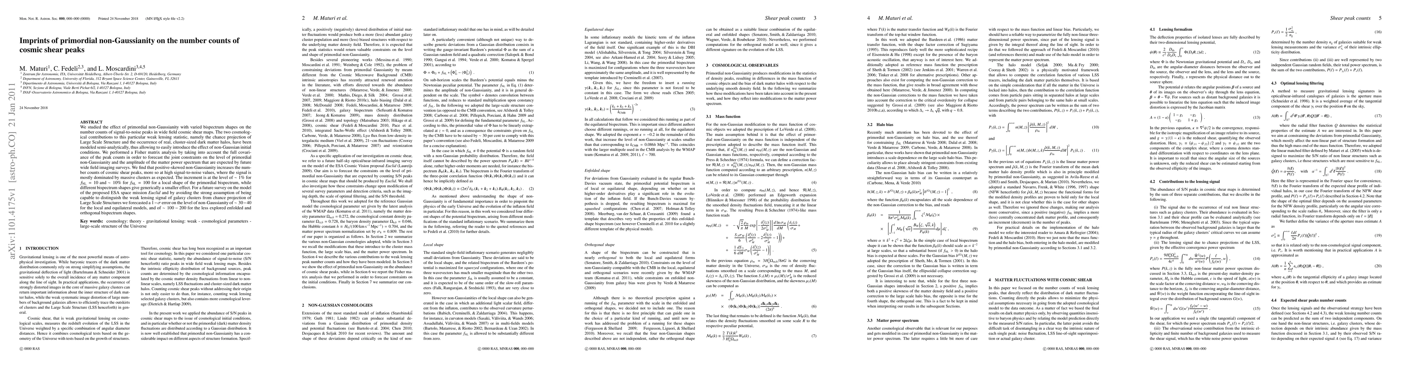 We studied the effect of primordial non-Gaussianity with varied bispectrum shapes on the number counts of signal-to-noise peaks in wide field cosmic shear maps. The two cosmological contributions to this particular weak lensing statistic, namely the chance projection of Large Scale Structure and the occurrence of real, cluster-sized dark matter halos, have been modeled semi-analytically, thus allowing to easily introduce the effect of non-Gaussian initial conditions. We performed a Fisher matrix analysis by taking into account the full covariance of the peak counts in order to forecast the joint constraints on the level of primordial non-Gaussianity and the amplitude of the matter power spectrum that are expected by future wide field imaging surveys. We find that positive-skewed non-Gaussianity increases the number counts of cosmic shear peaks, more so at high signal-to-noise values, where the signal is mostly dominated by massive clusters as expected. The increment is at the level of ~1 for f_NL=10 and ~10 for f_NL=100 for a local shape of the primordial bispectrum, while different bispectrum shapes give generically a smaller effect. For a future survey on the model of the proposed ESA space mission Euclid and by avoiding the strong assumption of being capable to distinguish the weak lensing signal of galaxy clusters from chance projection of Large Scale Structures we forecasted a 1-sigma error on the level of non-Gaussianity of ~30-40 for the local and equilateral models, and of ~100-200 for the less explored enfolded and orthogonal bispectrum shapes.