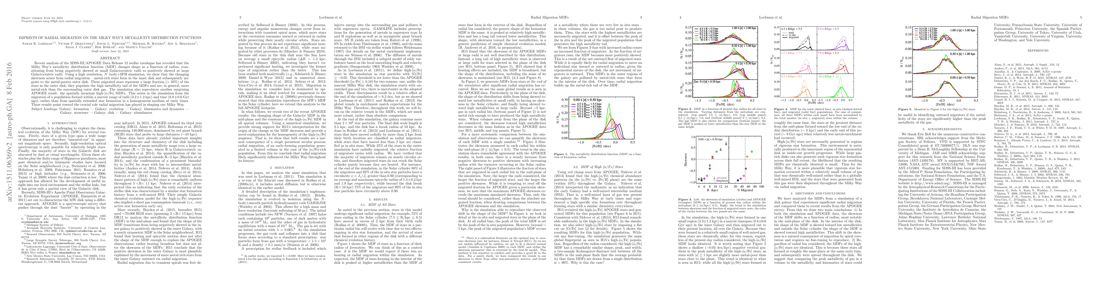 This paper demonstrates that radial migration significantly alters the Milky Way's metallicity distribution, with metal-rich stars migrating from the inner to the outer disk, causing a change in the skewness of the metallicity distribution function. The simulation also explains the invariant high-[alpha/Fe] MDFs across space, attributing them to a specific migration event.
