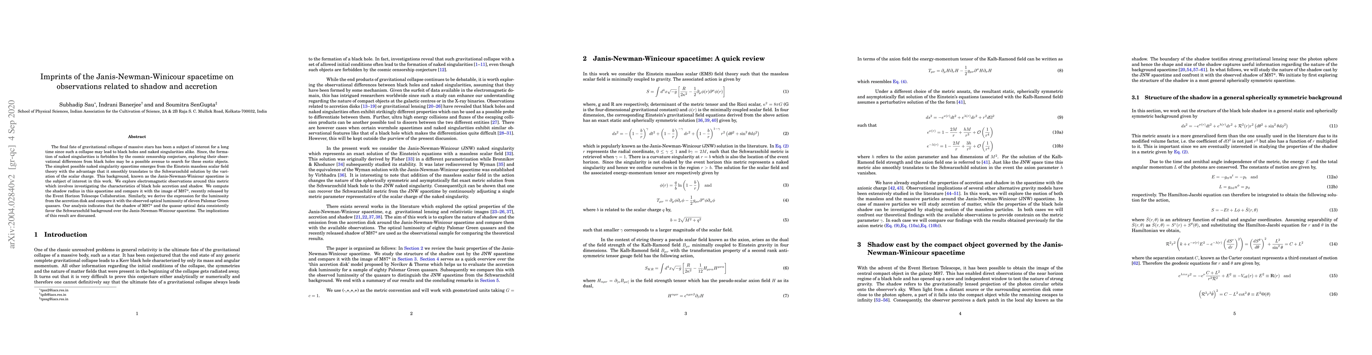 This paper investigates the observational signatures of the Janis-Newman-Winicour spacetime, a potential candidate for a naked singularity, by comparing its predicted shadow and accretion disk luminosity to observations of M87* and quasars. The study finds that current data favors the Schwarzschild black hole model over the Janis-Newman-Winicour spacetime.
