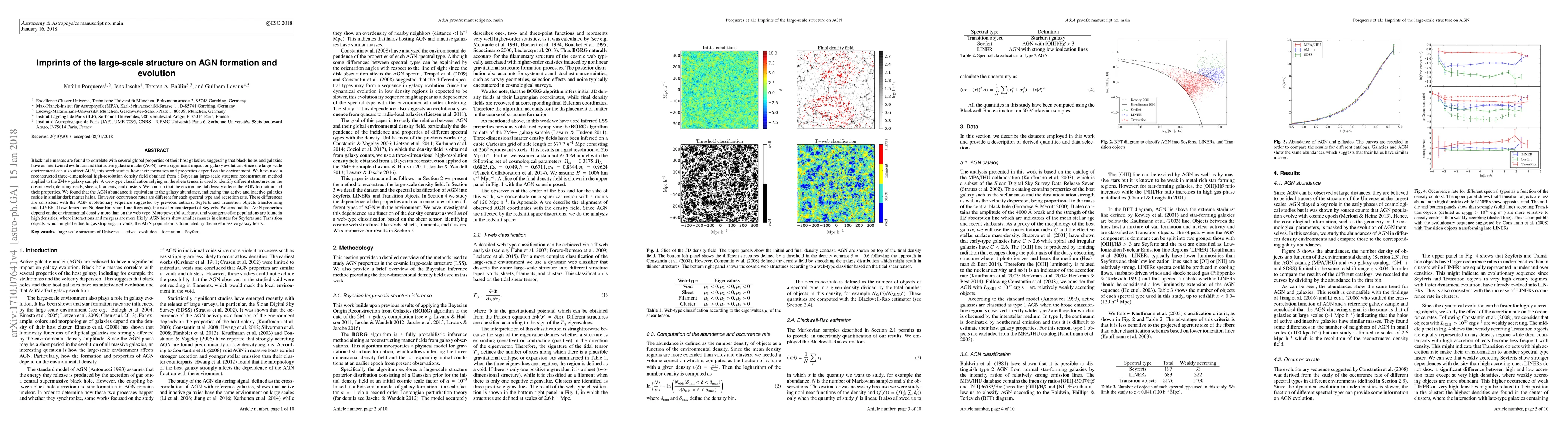 This paper investigates the influence of the large-scale structure on the formation and evolution of active galactic nuclei (AGN), finding that AGN abundance correlates with galaxy abundance. It concludes that AGN properties are more dependent on environmental density than on cosmic web structure, with higher densities correlating to more powerful starbursts and younger stellar populations.
