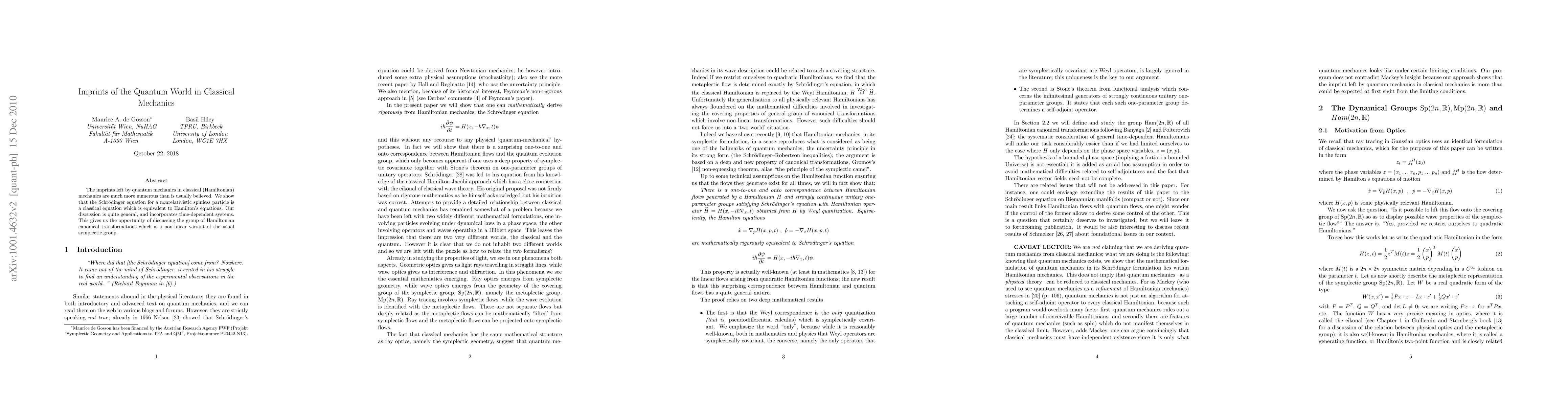 The imprints left by quantum mechanics in classical (Hamiltonian) mechanics are much more numerous than is usually believed. We show Using no physical hypotheses) that the Schroedinger equation for a nonrelativistic system of spinless particles is a classical equation which is equivalent to Hamilton's equations.
