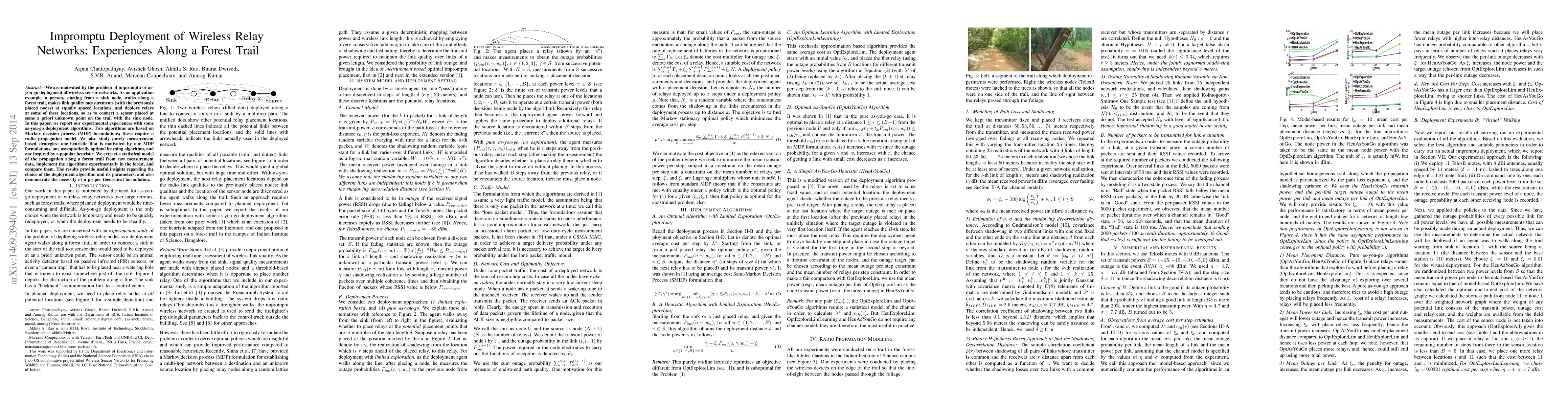 This paper explores algorithms for the impromptu deployment of wireless relay networks along a forest trail, comparing Markov decision process-based methods with measurement-driven heuristics. Experimental results highlight the effectiveness of different strategies and underscore the importance of a sound theoretical foundation.