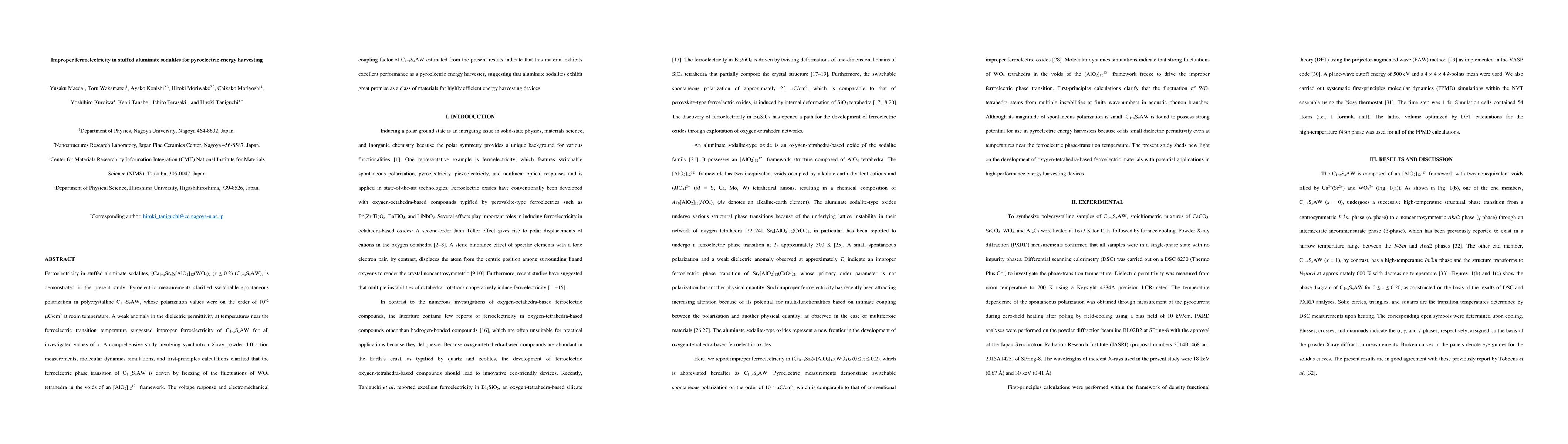 Ferroelectricity in stuffed aluminate sodalites is demonstrated in the present study. The present results indicate that stuffed aluminate sodalites exhibit excellent performance as a pyroelectric energy harvester, suggesting that they exhibit great promise as a class of materials for highly efficient energy harvesting devices. (See manuscript for the full abstract)