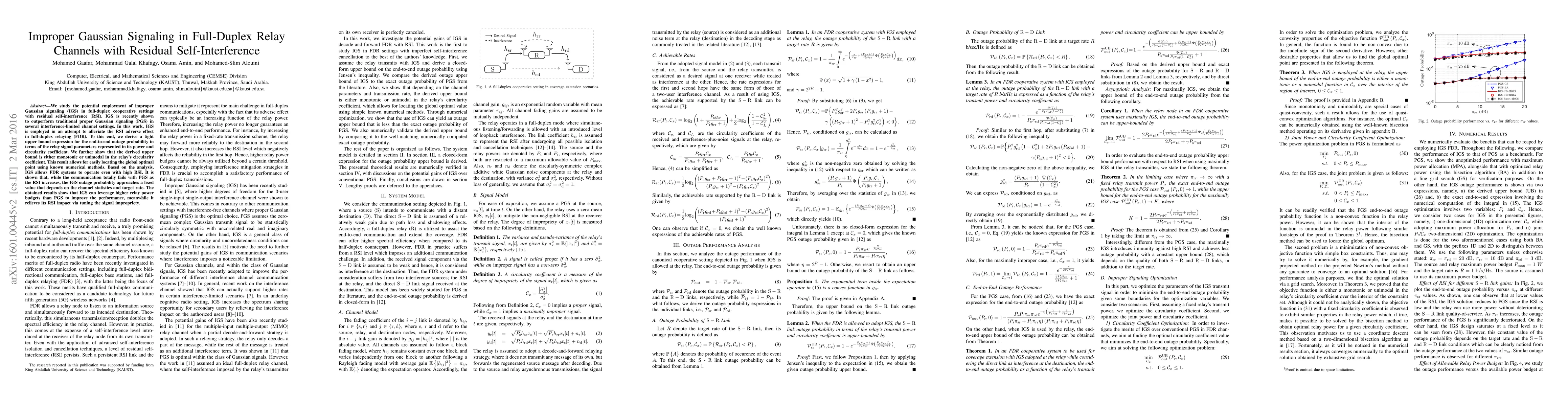 This paper investigates improper Gaussian signaling (IGS) in full-duplex relay channels with residual self-interference (RSI), demonstrating its effectiveness over traditional proper Gaussian signaling (PGS). The study derives an upper bound for end-to-end outage probability, showing that IGS can maintain performance even with high RSI, unlike PGS, which fails as RSI increases.