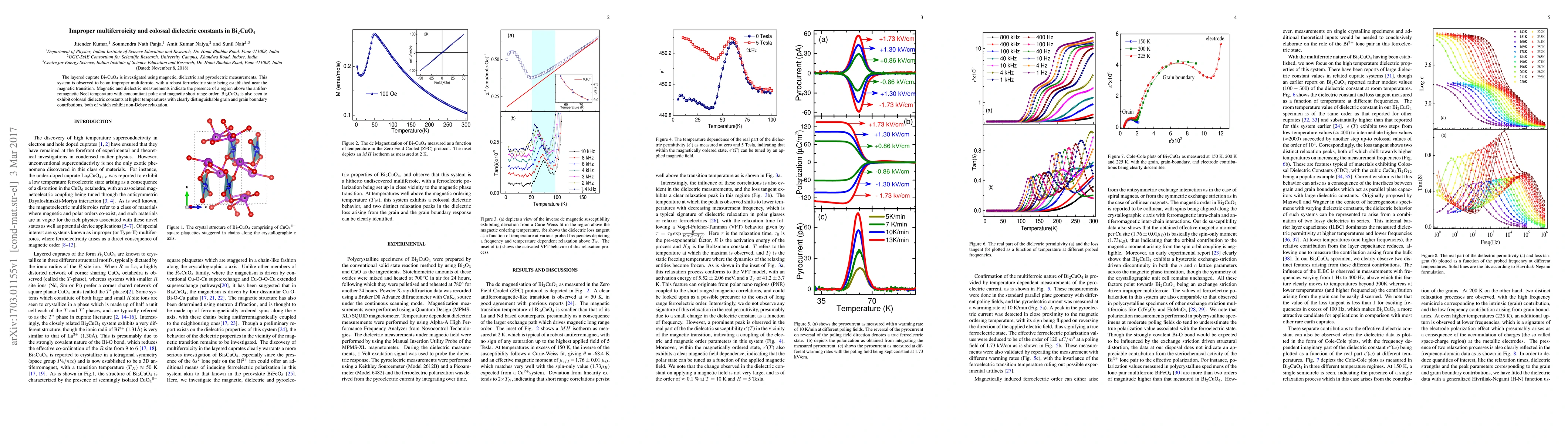 Bi₂CuO₄ demonstrates improper multiferroicity with a robust ferroelectric state near the magnetic transition, alongside colossal dielectric constants with distinct grain and grain boundary contributions showing non-Debye relaxation.