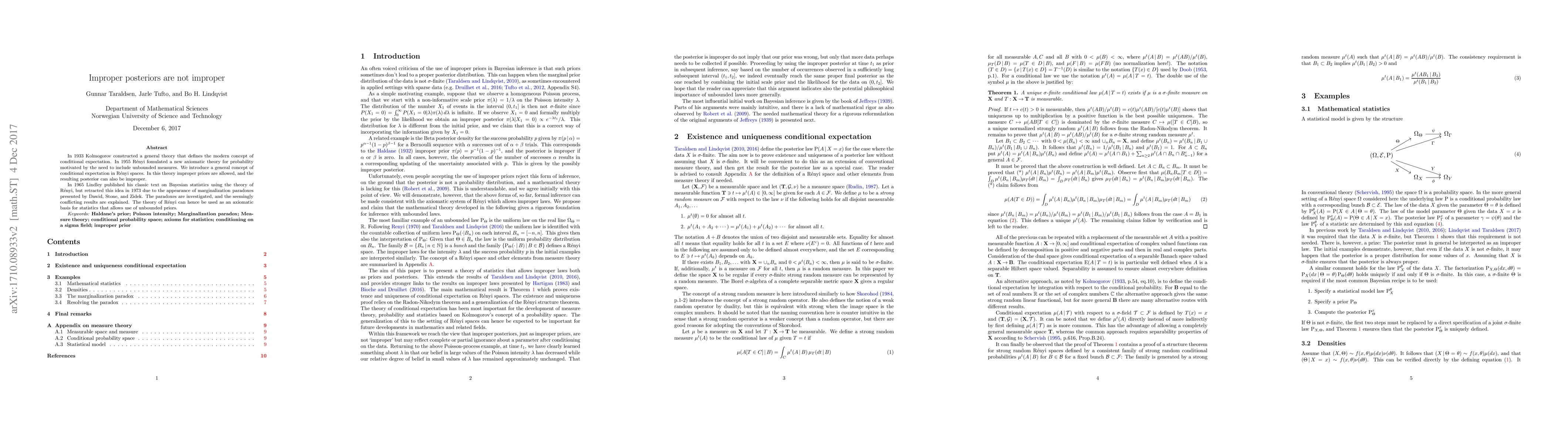 This paper explores the use of Renyi spaces to define conditional expectation, allowing for the use of improper priors in Bayesian statistics. It resolves apparent paradoxes in Lindley's earlier work by explaining how the theory of Renyi can accommodate unbounded priors, thus providing a robust framework for statistical inference.