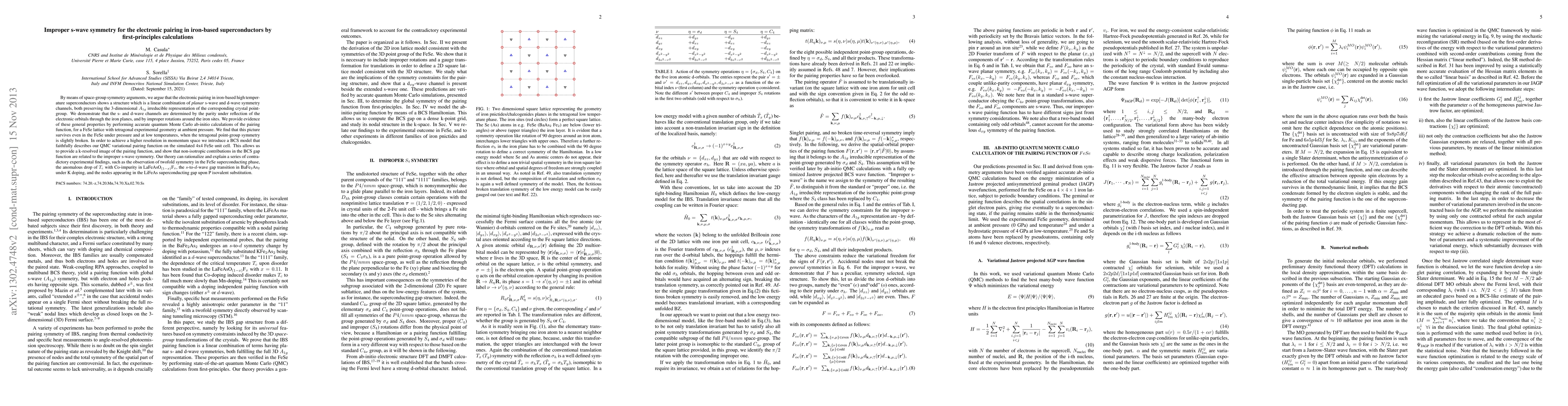 By means of space-group symmetry arguments, we argue that the electronic pairing in iron-based high temperature superconductors shows a structure which is a linear combination of planar s-wave and d-wave symmetry channels, both preserving the 3-dimensional A_1g irreducible representation of the corresponding crystal point-group. We demonstrate that the s- and d-wave channels are determined by the parity under reflection of the electronic orbitals through the iron planes, and by improper rotations around the iron sites. We provide evidence of these general properties by performing accurate quantum Monte Carlo ab-initio calculations of the pairing function, for a FeSe lattice with tetragonal experimental geometry at ambient pressure. We find that this picture survives even in the FeSe under pressure and at low temperatures, when the tetragonal point-group symmetry is slightly broken. In order to achieve a higher resolution in momentum space we introduce a BCS model that faithfully describes our QMC variational pairing function on the simulated 4x4 FeSe unit cell. This allows us to provide a k-resolved image of the pairing function, and show that non-isotropic contributions in the BCS gap function are related to the improper s-wave symmetry. Our theory can rationalize and explain a series of contradictory experimental findings, such as the observation of twofold symmetry in the FeSe superconducting phase, the anomalous drop of T_c with Co-impurity in LaFeAsO_(1-x)F_x, the s-to-d-wave gap transition in BaFe_2As_2 under K doping, and the nodes appearing in the LiFeAs superconducting gap upon P isovalent substitution.