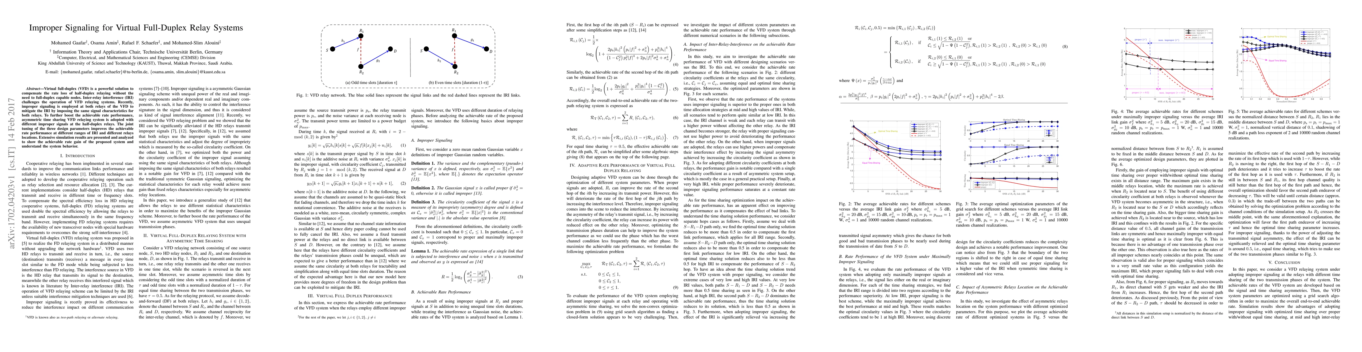 This paper investigates the use of improper signaling in virtual full-duplex relay systems to mitigate inter-relay interference and enhance achievable rate performance. It proposes an asymmetric time-sharing VFD relaying system with tailored improper signals for half-duplex relays, optimizing three design parameters to achieve rate gains under varying interference levels and relay locations.
