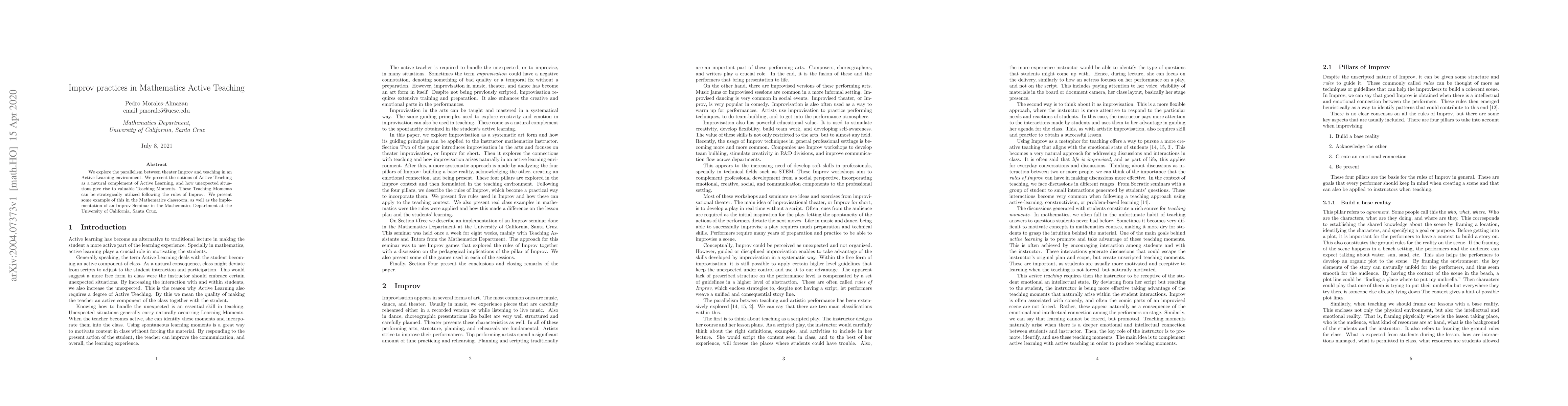 This article explores the parallels between improvisational theater (Improv) and teaching in an Active Learning environment. It presents the notions of Active Teaching as a natural complement to Active Learning, and discusses how unexpected situations give rise to valuable Teaching Moments. These Teaching Moments can be strategically utilized following the rules of Improv. This article presents some examples of this in the Mathematics classroom, as well as the implementation of an Improv Seminar in the Mathematics Department at the University of California, Santa Cruz.