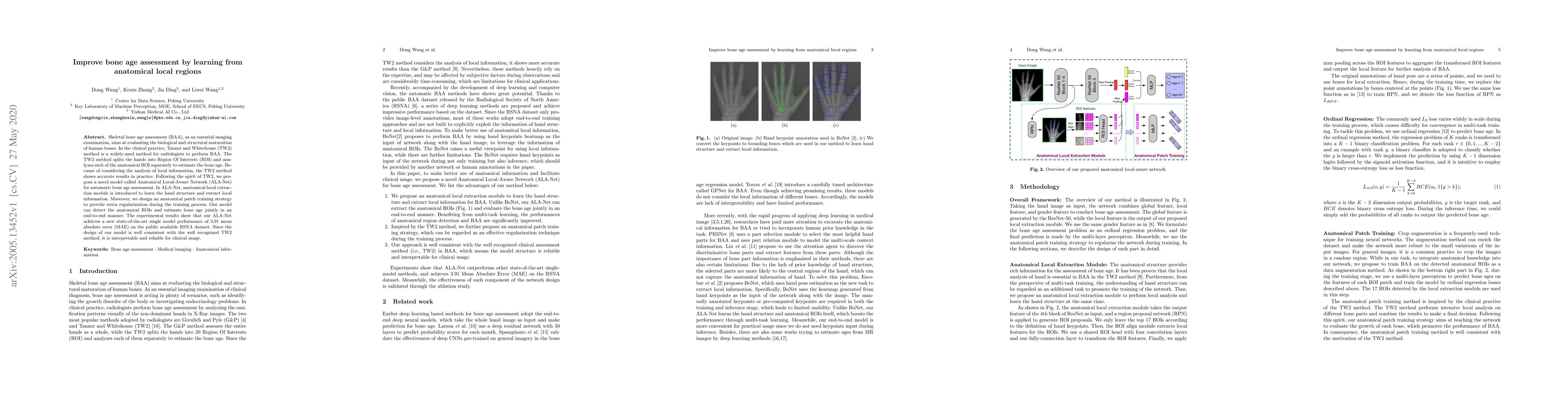 The paper proposes ALA-Net, an Anatomical Local-Aware Network for automatic bone age assessment, which extracts local anatomical information from hand images to improve accuracy. The model achieves a state-of-the-art mean absolute error of 3.91 on the RSNA dataset and is interpretable, aligning well with the TW2 method for clinical use.