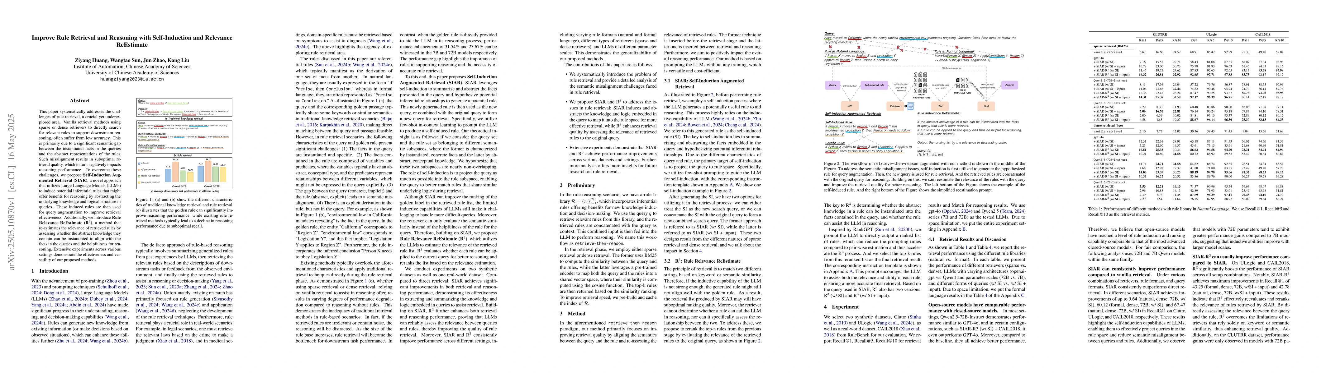 This paper proposes two methods to improve rule retrieval for reasoning: Self-Induction Augmented Retrieval (SIAR) generates potential inferential rules using Large Language Models, and Rule Relevance ReEstimate (R$^3$) re-evaluates the relevance of retrieved rules. The methods are shown to be effective in improving reasoning performance across various settings.