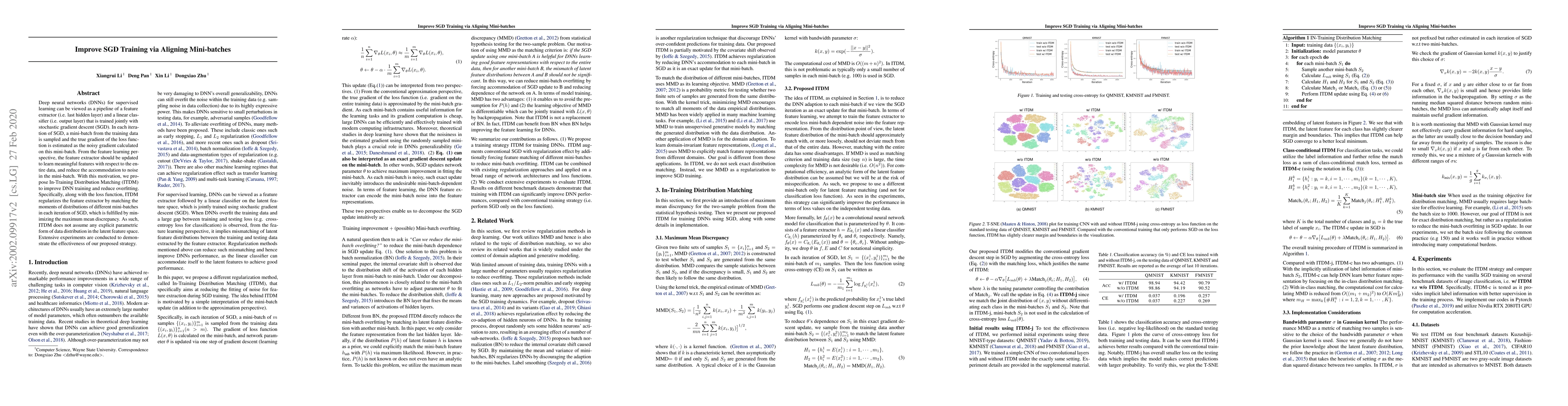 This paper proposes In-Training Distribution Matching (ITDM) to enhance SGD training of deep neural networks by aligning the distributions of mini-batches, thereby reducing overfitting and improving feature learning. ITDM achieves this by minimizing the maximum mean discrepancy between mini-batch distributions during training, without assuming any specific data distribution form.