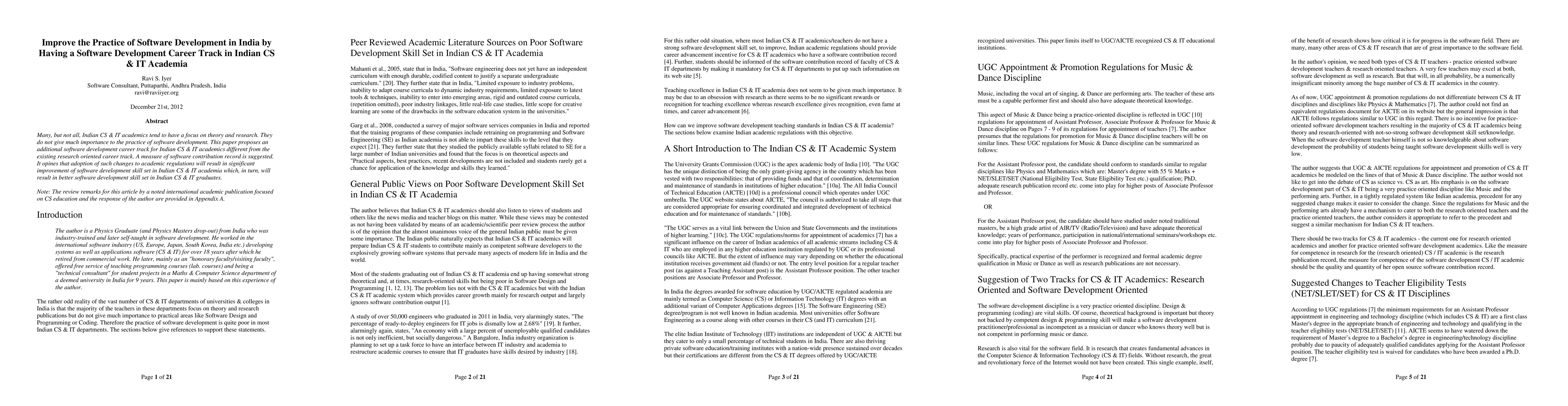 Many, but not all, Indian CS & IT academics tend to have a focus on theory and research. They do not give much importance to the practice of software development. This paper proposes an additional software development career track for Indian CS & IT academics different from the existing research oriented career track. A measure of software contribution record is suggested. It opines that adoption of such changes to academic regulations will result in significant improvement of software development skill set in Indian CS & IT academia which, in turn, will result in better software development skill set in Indian CS & IT graduates.