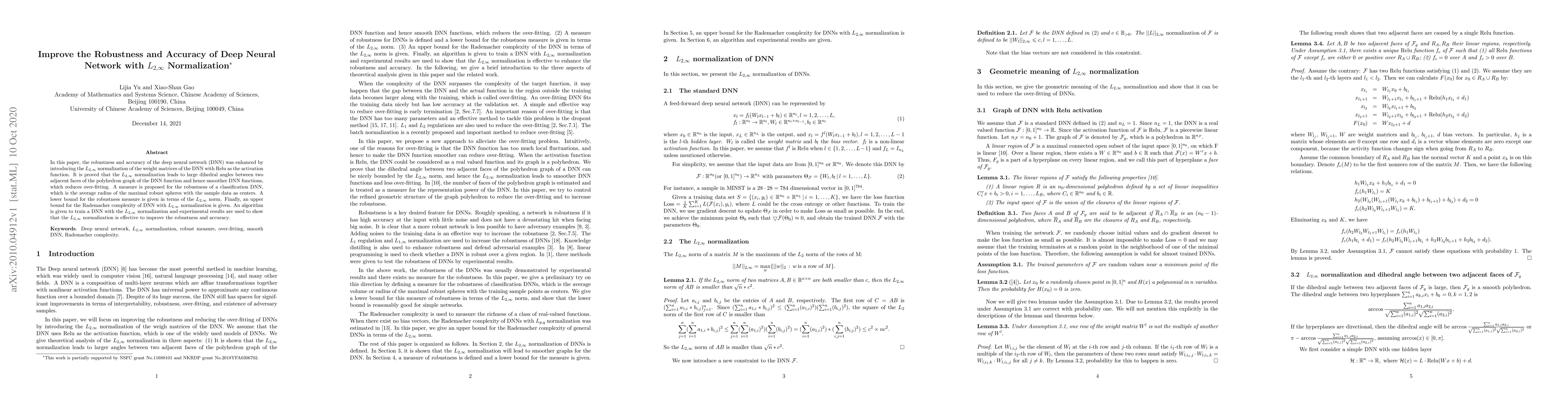 In this paper, the robustness and accuracy of the deep neural network (DNN) was enhanced by introducing the $L_{2,\infty}$ normalization of the weight matrices of the DNN with Relu as the activation function. It is proved that the $L_{2,\infty}$ normalization leads to large dihedral angles between two adjacent faces of the polyhedron graph of the DNN function and hence smoother DNN functions, which reduces over-fitting. A measure is proposed for the robustness of a classification DNN, which is the average radius of the maximal robust spheres with the sample data as centers. A lower bound for the robustness measure is given in terms of the $L_{2,\infty}$ norm. Finally, an upper bound for the Rademacher complexity of DNN with $L_{2,\infty}$ normalization is given. An algorithm is given to train a DNN with the $L_{2,\infty}$ normalization and experimental results are used to show that the $L_{2,\infty}$ normalization is effective to improve the robustness and accuracy.