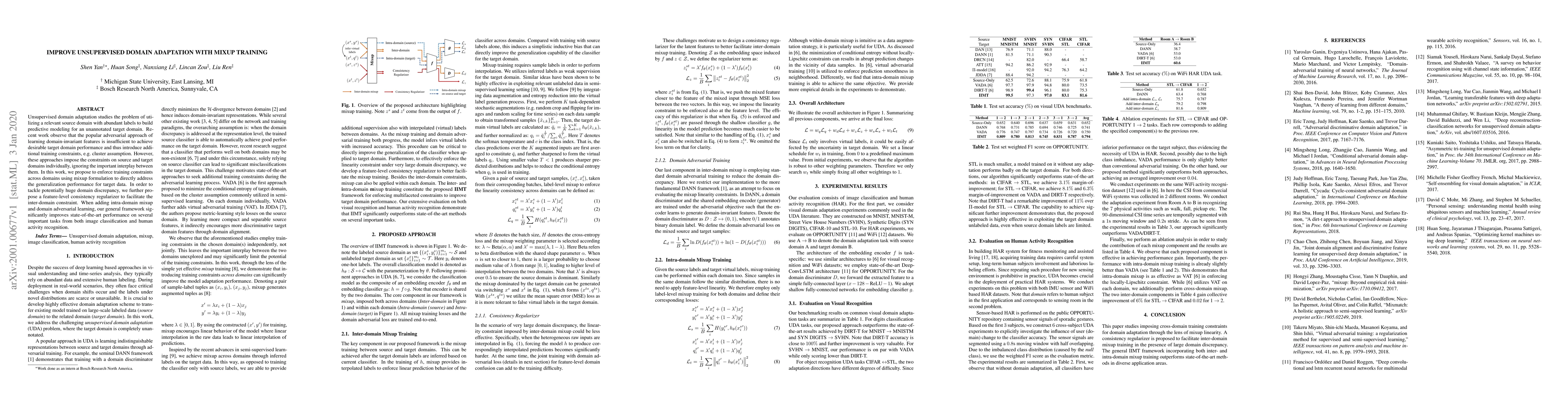 This paper proposes a mixup training approach to enhance unsupervised domain adaptation by enforcing training constraints across source and target domains, addressing the generalization performance for target data. The method combines intra-domain mixup, feature-level consistency regularizer, and domain adversarial learning, achieving state-of-the-art results in image classification and human activity recognition tasks.