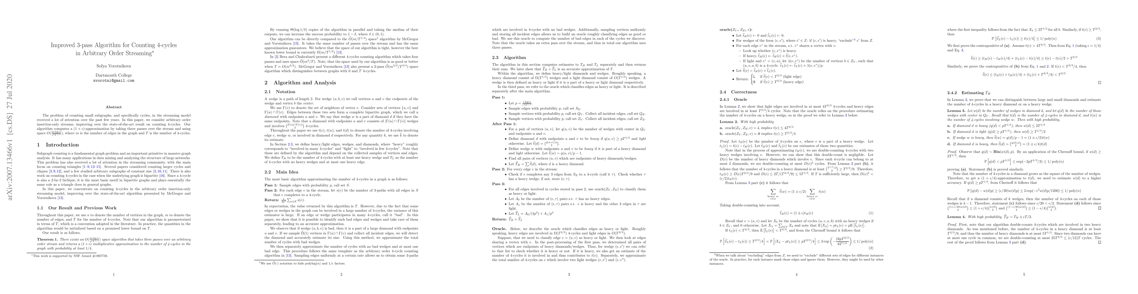 The problem of counting small subgraphs, and specifically cycles, in the streaming model received a lot of attention over the past few years. In this paper, we consider arbitrary order insertion-only streams, improving over the state-of-the-art result on counting 4-cycles. Our algorithm computes a $(1+\epsilon)$-approximation by taking three passes over the stream and using space $O(\frac{m \log n}{\epsilon^2 T^{1/3}})$, where $m$ is the number of edges in the graph and $T$ is the number of 4-cycles.